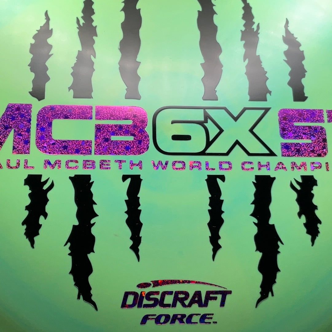 The Discraft Commemorative 6x Paul McBeth ESP Force is an overstable 12 speed that is the workhorse driver in McBeth’s bag. He is uses it for flex shots and hyzers. The stamp features 6 slashes on the disc, they represent his 6 world titles, his most recent in 2022 in Emporia, Kansas.