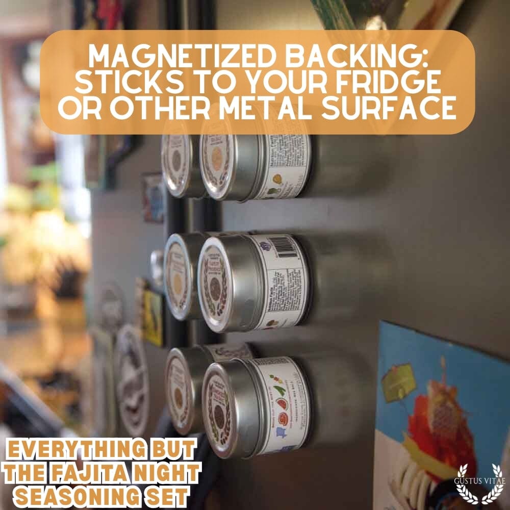 - Magnetized backing: tins sticks to your fridge or other metal surface.
