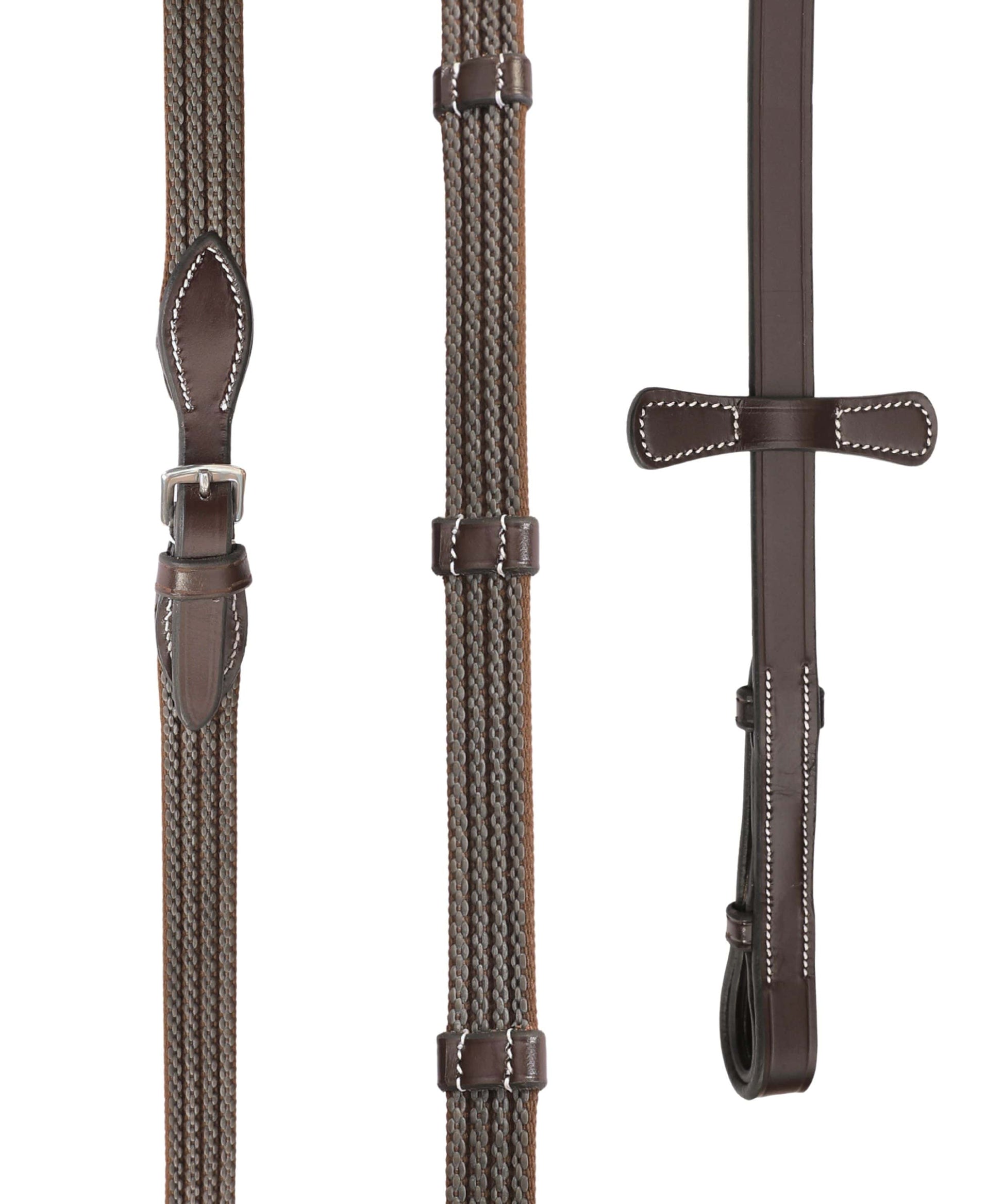 The Exion Rubber Web Reins are a perfect fusion of durable webbing with rubber, designed to deliver both strength and sophistication. Four finely stitched rubber strands are woven into the web fabric, giving these reins exceptional grip, flexibility, and an elegant finish.