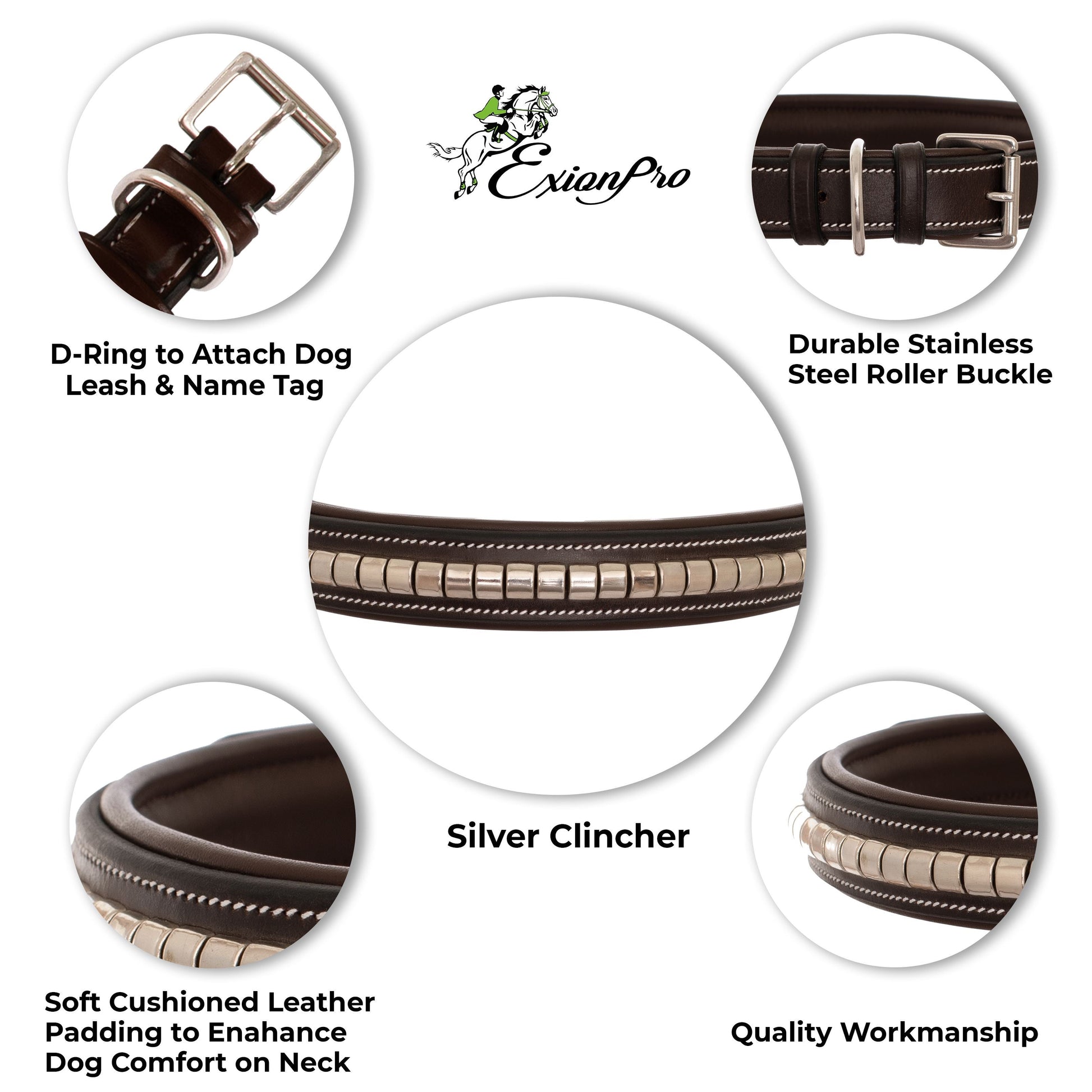ExionPro Silver Clincher Padded Leather Dog Collar is made from 100% Genuine Full Grain Vegetable Tanned Leather. The Leather used is of the foremost quality. It gives superior strength and durability which makes these dog collars perfect for Active and Large Dogs.