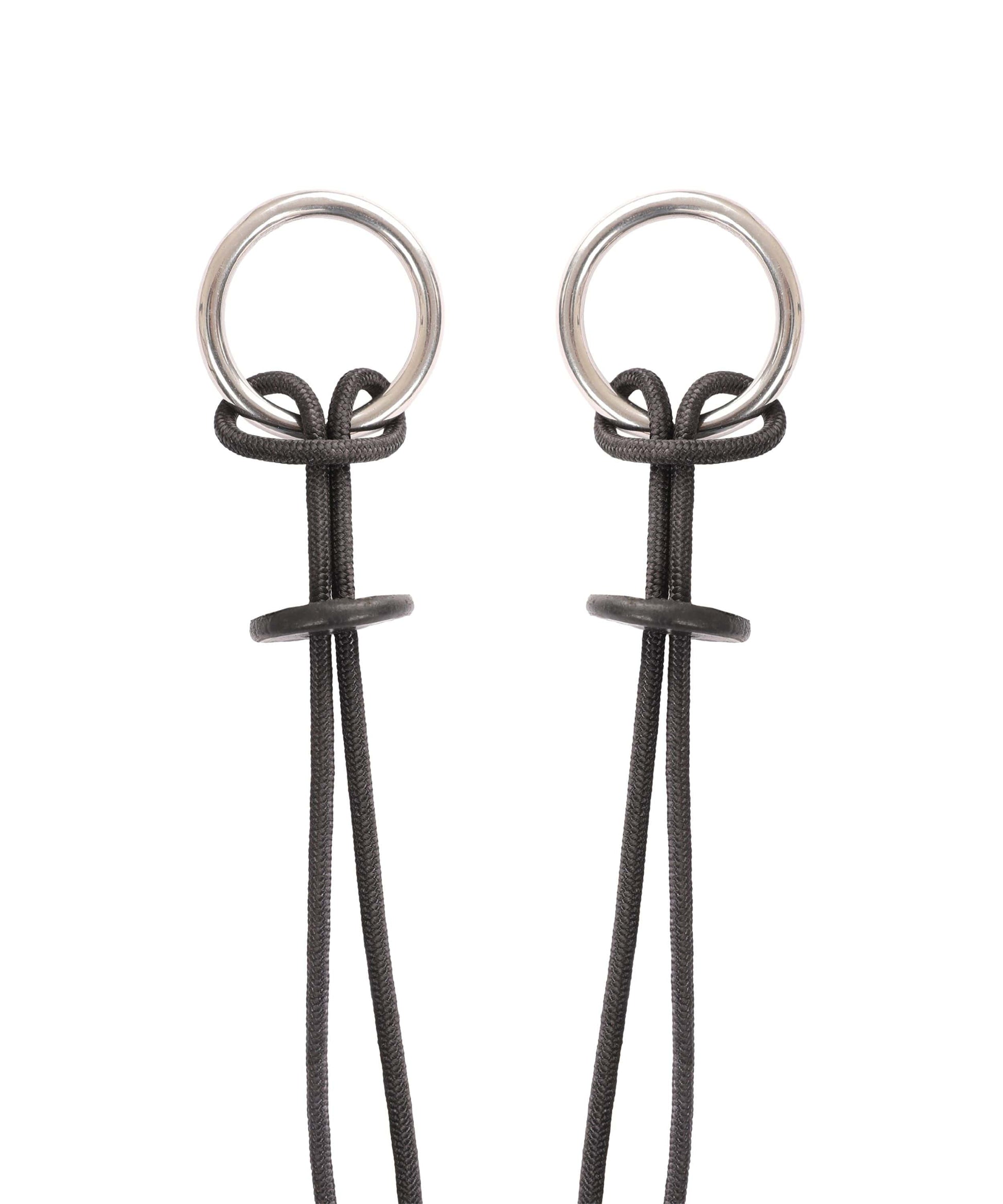 The rings are not stitched onto the nylon ropes but fixed with a rope loop only. Just slide the rope down through the gag bit, then loop the rope over the ring.