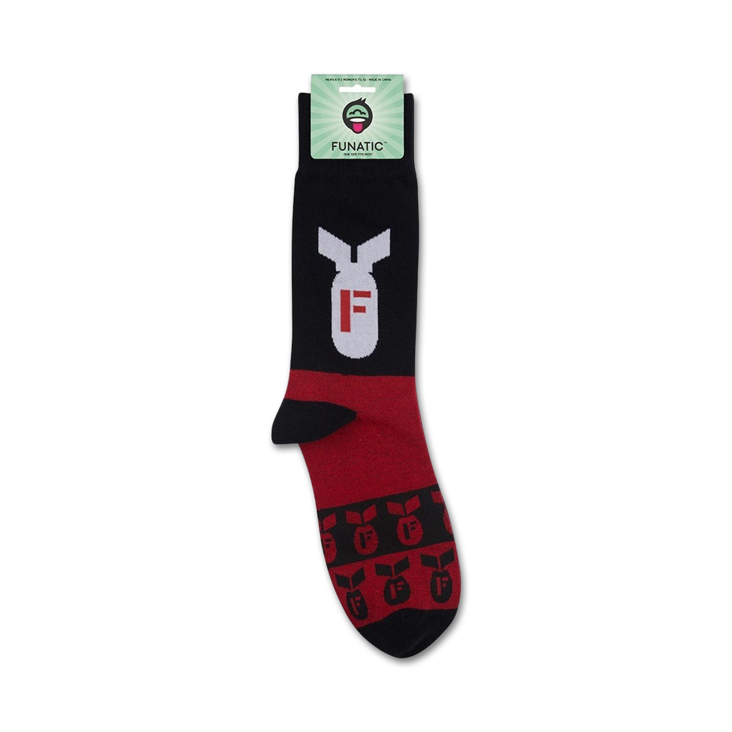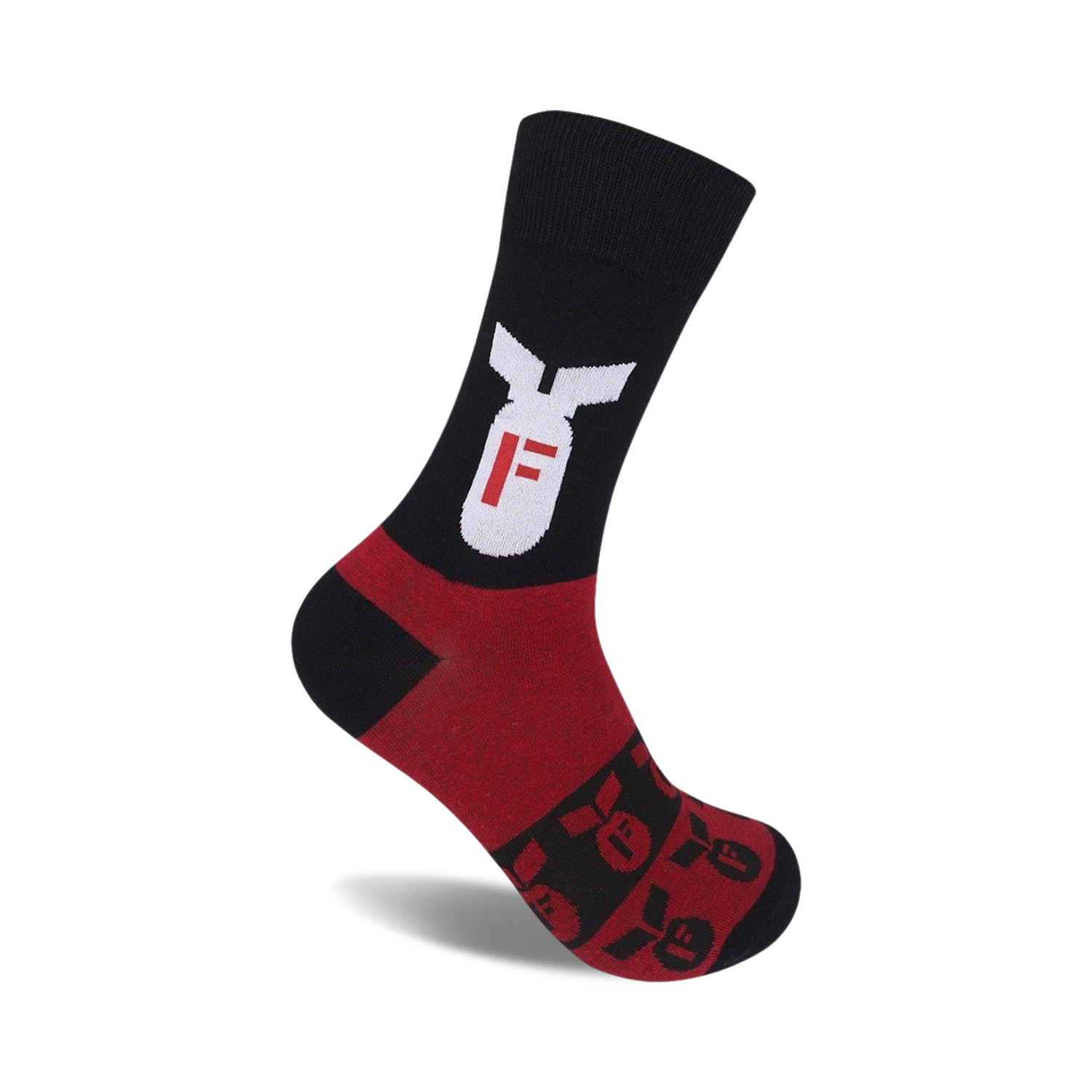 You heard it here first, folks: socks just got serious! Introducing the F-Bomb socks, where black meets red and white in a thrilling showdown. Picture this: a black sock, bold as a midnight sky, accented with a blazing red toe and heel. And wait for it...a white F-16 fighter jet dropping a bomb right on a mushroom cloud. These socks aren't just foot coverings; they're a statement. They're a declaration of your love for the unexpected, your appreciation for the extraordinary. Put on a pair of F-Bomb socks and let your feet do the talking. From airshows to underground bunkers, these socks will turn heads and drop jaws. Don't be surprised if you start hearing compliments left, right, and center.