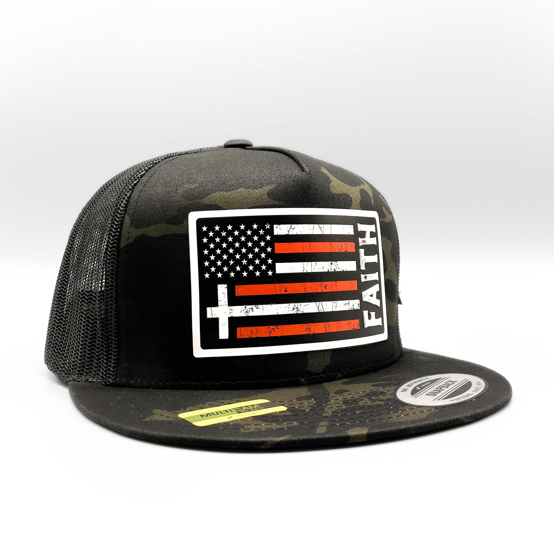 This limited edition Christian trucker hat features a dimensional artistic take on the American flag with a raised cross as one of the stripes on the flag and a raised set of letters spelling out FAITH on a black multicam licensed camouflage and black mesh, premium Yupoong 6006 Classic high-crown mesh snapback baseball cap.