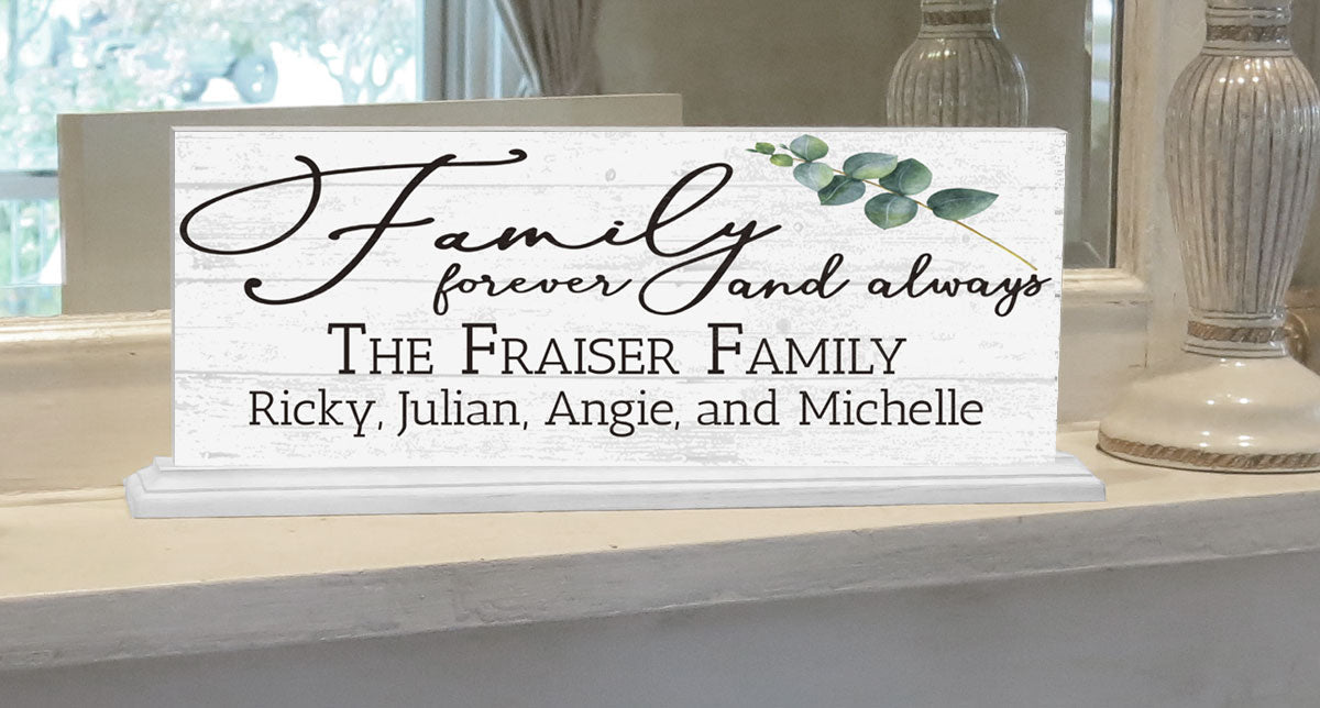 THE PERFECT INSPIRATIONAL GIFT IDEA For A SPECIAL FAMILY! Make them smile with a personalized gift just for them! This modern, farmhouse style Family Forever And Always family name mantel sign or shelf decoration makes a wonderful inspirational gift for yourself or a close family in your life. We create these top quality personalized family themed home decor gifts daily so you don't wait for a long personalization process. We only use solid wood for our custom family name home decor signs. This wonderful, free standing, personalized Family Forever and Always sign is the perfect size for any room at 16.5 in long by 6.25in tall - not too big or too small for any home decor! The Perfect Gift Idea For Any Special Person, Couple, Or Family In Your Life!