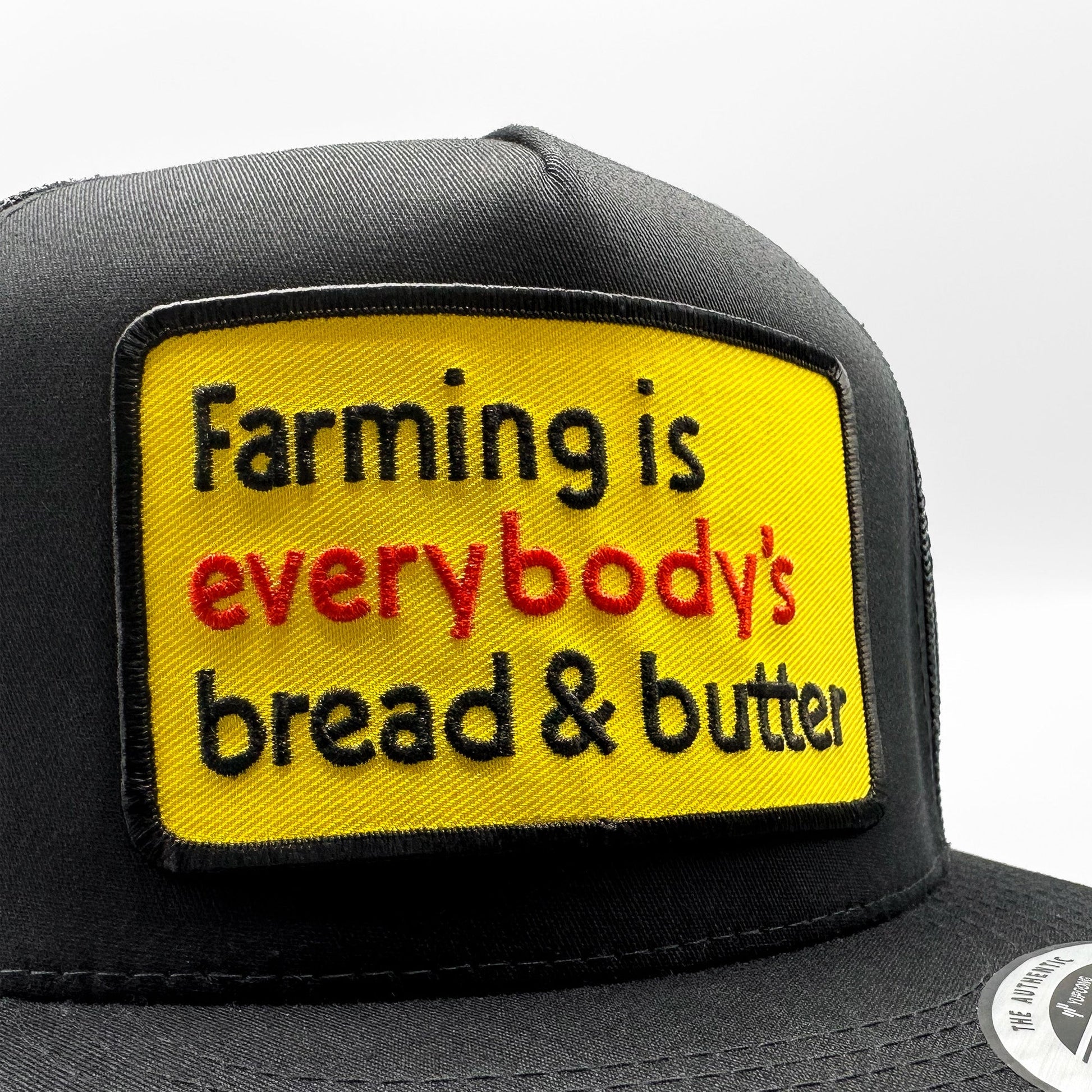This listing is for retro Farming is Everybody's Bread & Butter embroidered patch on one of our best-selling (and best fitting) baseball style trucker hats -- a black Yupoong 6006 Classic mesh snapback trucker hat.