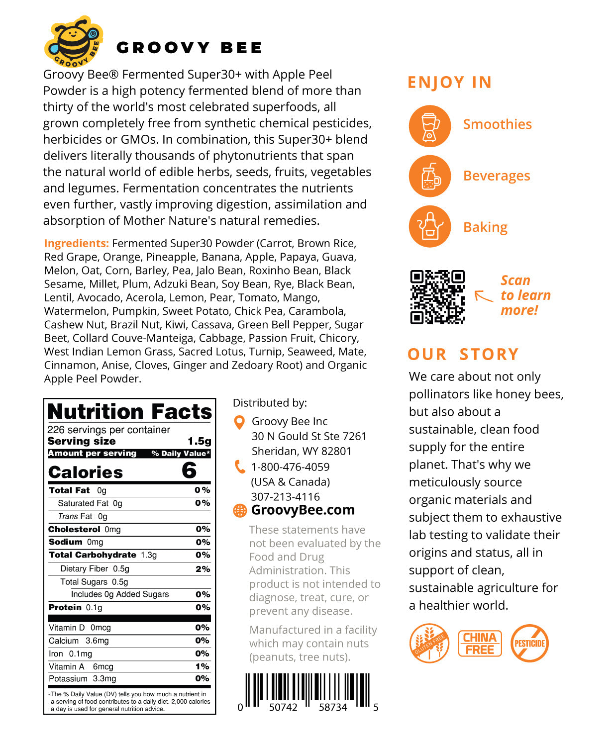 Specially formulated to provide a wide variety of essential nutrients and phytonutrients, Groovy Bee® Fermented Super30+ with Organic Apple Peel Powder contains no gluten, GMOs or pesticides. It is also plant-based, non-China, certified Kosher and extensively lab tested for glyphosate, heavy metals and microbiology.