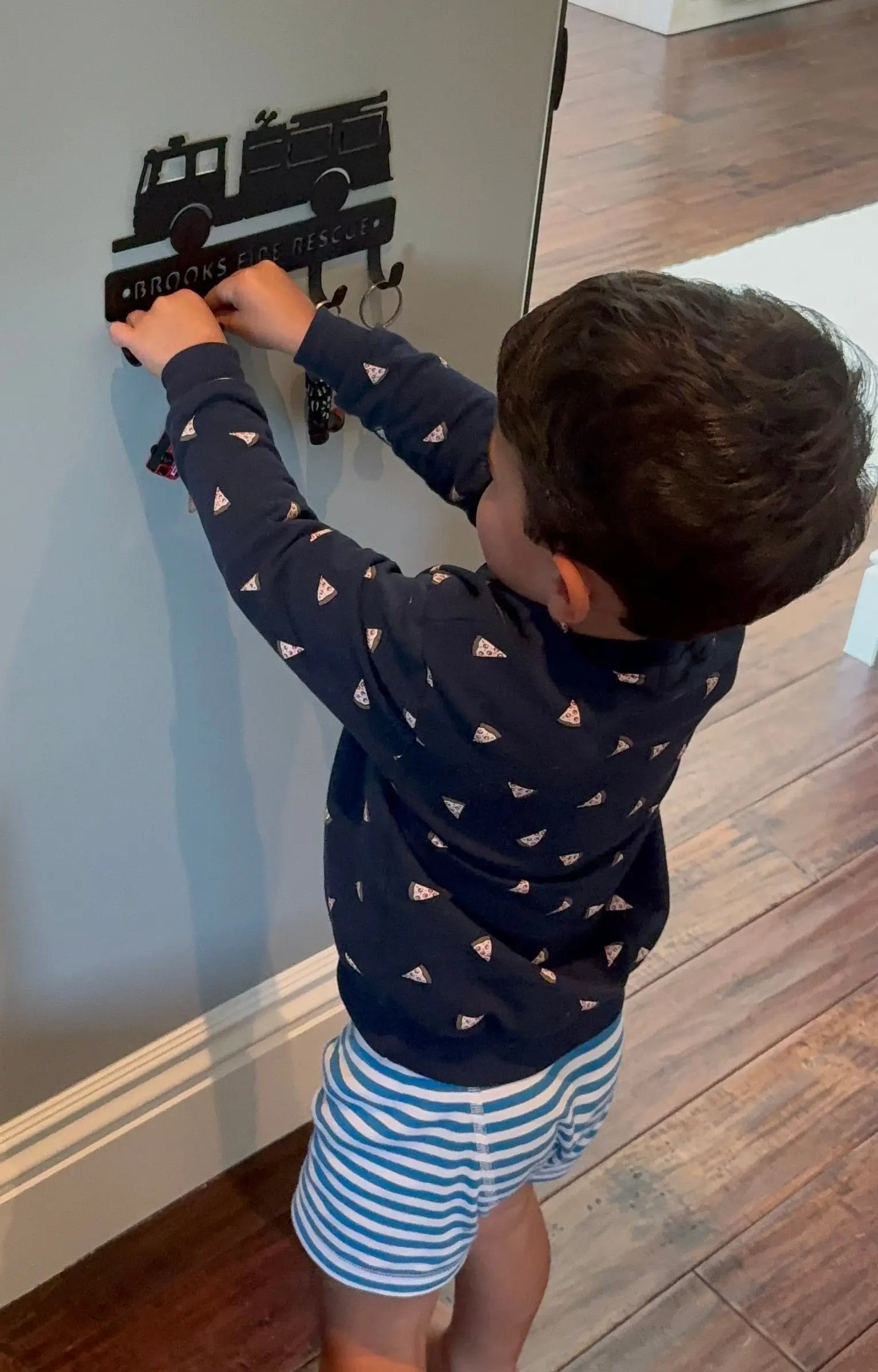 - This firefighter key rack is great for organizing and storage in the home, office, garage, or barn! This key and leash holder has 5 rounded hooks for hanging car keys, your dog leash or harness, lanyards, cables & cords, medals, necklaces, face masks, or other small items. And a magnet will stick to it.