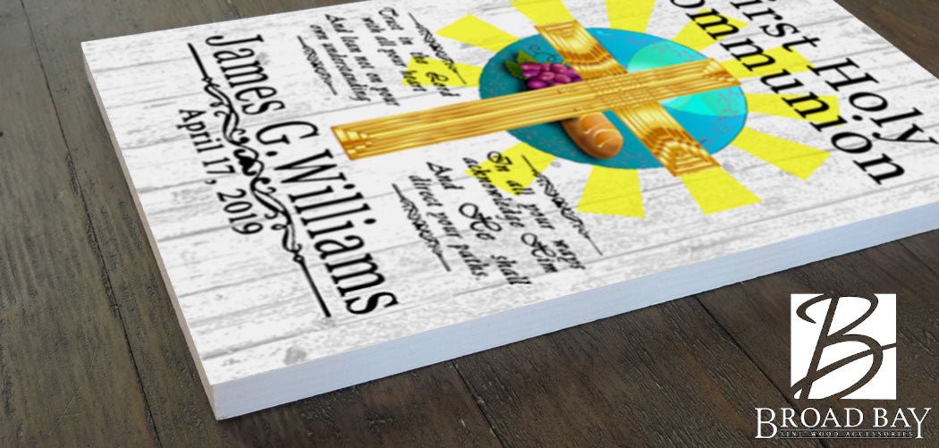 This wonderful personalized first communion sign is the perfect 1st communion gift for a boy or girl! Carefully crafted from solid wood, this unique personalized Communion gift sign will be cherished for years to come. The artwork is carefully applied to the wood in a unique process developed to allow the beauty of the wood to show through the design. Personalized with the child's name and first communion date, this custom first communion gift is perfect over a bed, on a desk, on the mantel, or hanging anywhere in the home, as a loving 1st communion remembrance.