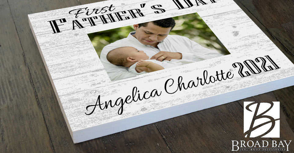 This personalized 1st Father's Day photo frame alternative makes the perfect unique, custom new baby gift idea for a new father! Upload your photo and we will print your picture directly onto the solid wood. This Broad Bay personalized new father gift frame alternative is well-made from solid wood and features a popular modern farmhouse style design that will complement any decor! Made to display on a shelf, desk, mantel or wall, the Broad Bay personalized First Father's Day present picture frame alternative is the perfect wooden frame alternative for your baby's photo. A great gift idea for new dads! Overall Size 10.5in x 10.5in