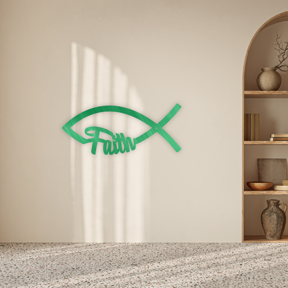 Introducing Fish Faith - a stunning piece of art made from 16 gauge powder coated steel. This unique fish outline shape features the word "Faith" embodied at the bottom. Add a touch of inspiration to any space with this beautiful metal art piece.
