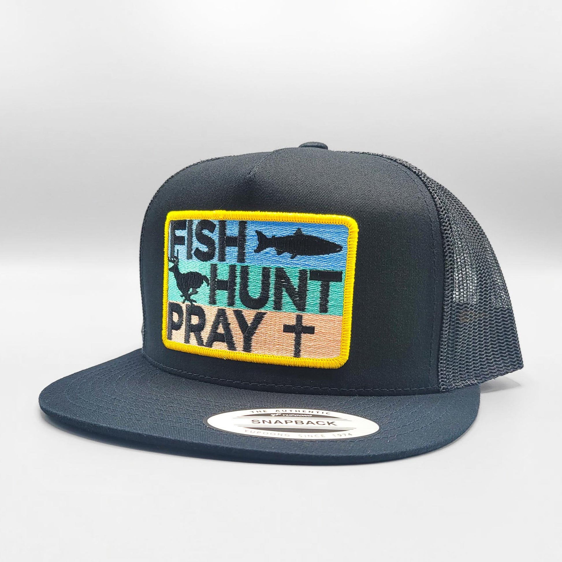 The Fish Hunt Pray multi-color embroidered patch is applied to an all black, premium Yupoong 6006 Classic high-crown mesh snapback baseball cap.