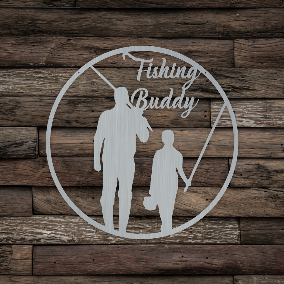Introducing the perfect addition to any fishing enthusiast's collection - Fishing Buddy! Made with durable 16 gauge steel and a beautiful powder coated finish, this circular metal sign features a heartwarming father and child fishing silhouette, accompanied by elegant cursive writing. Get yours today and proudly display your love for fishing!