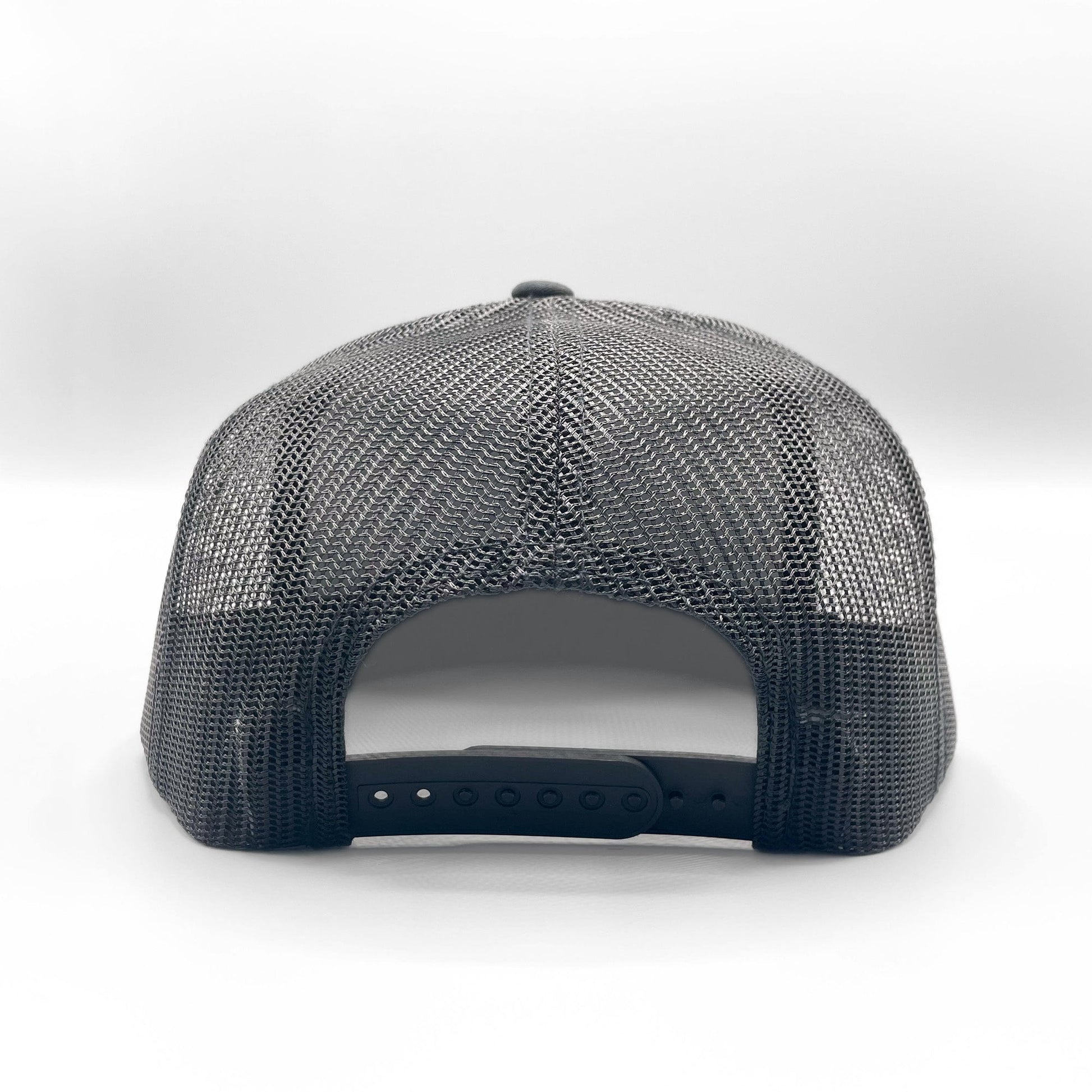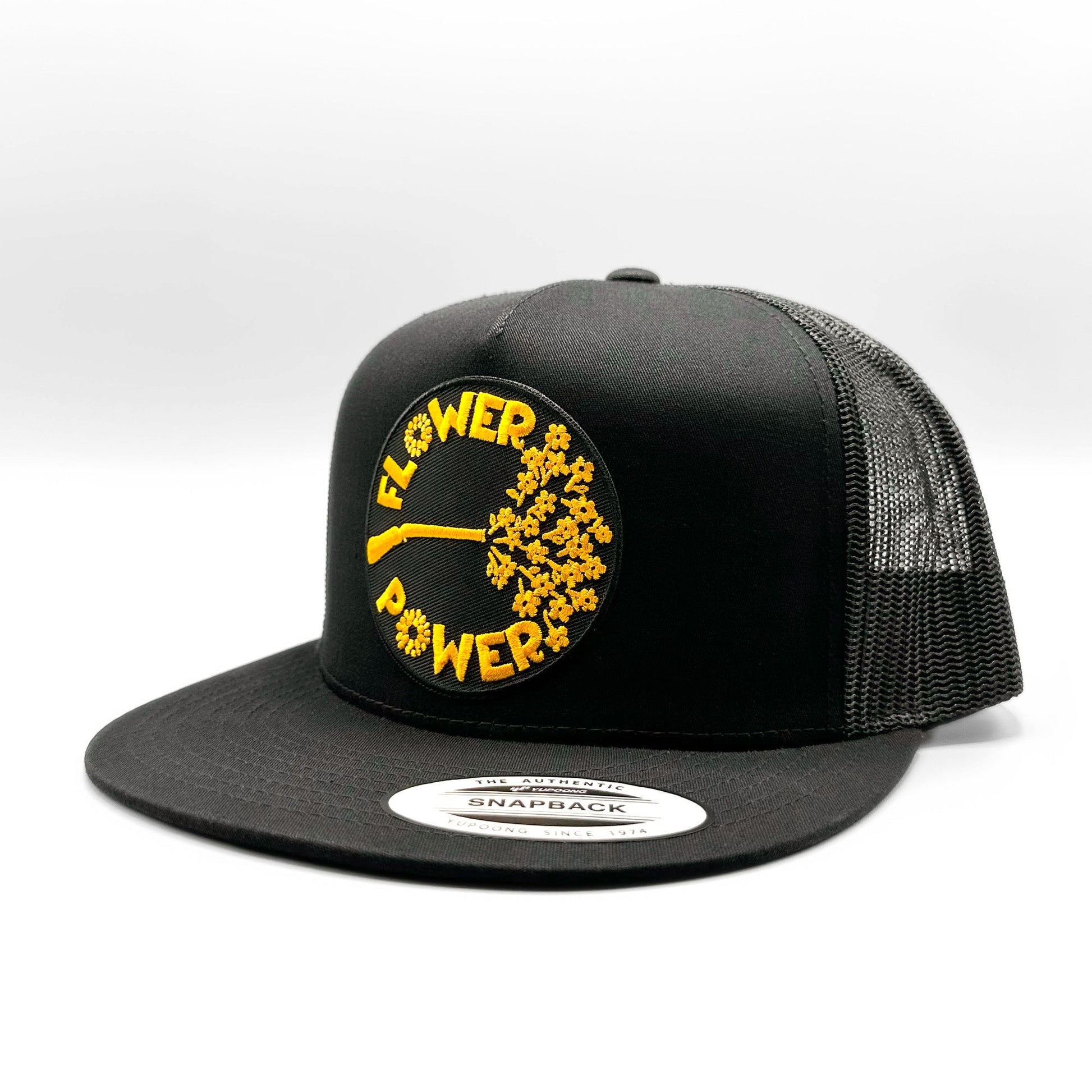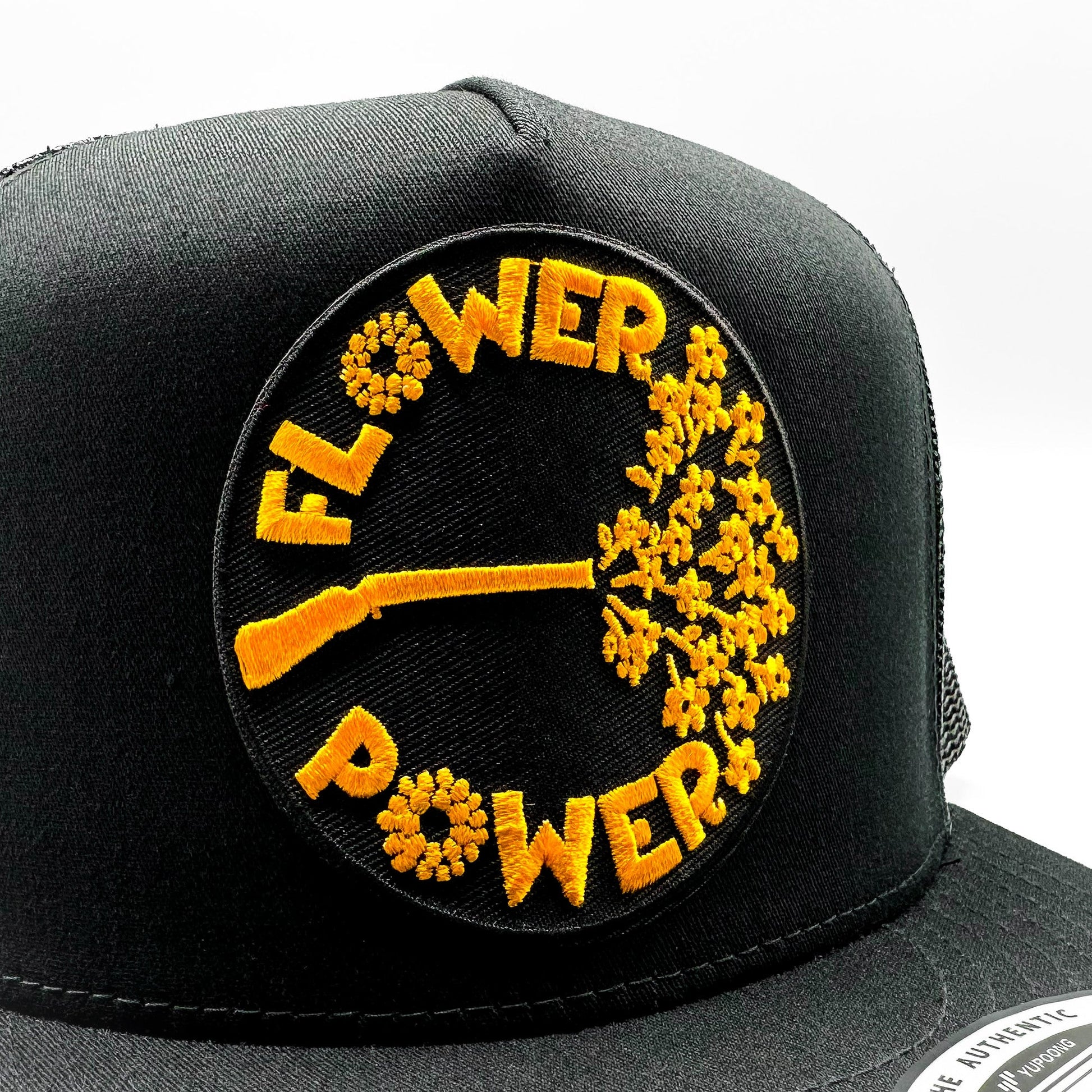 Rare Flower Power vintage embroidered patch on one of our best-selling (and best fitting) baseball style trucker hats -- a black Yupoong 6006 Classic snapback trucker hat.