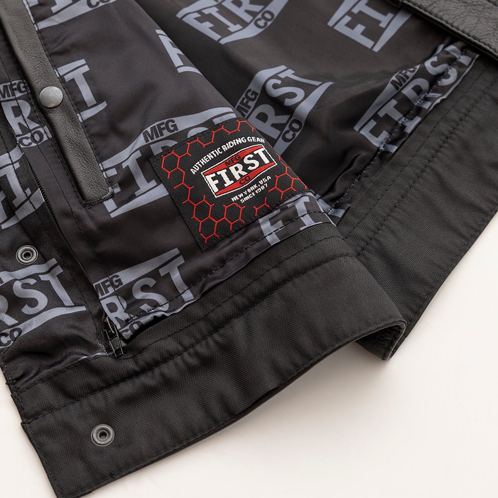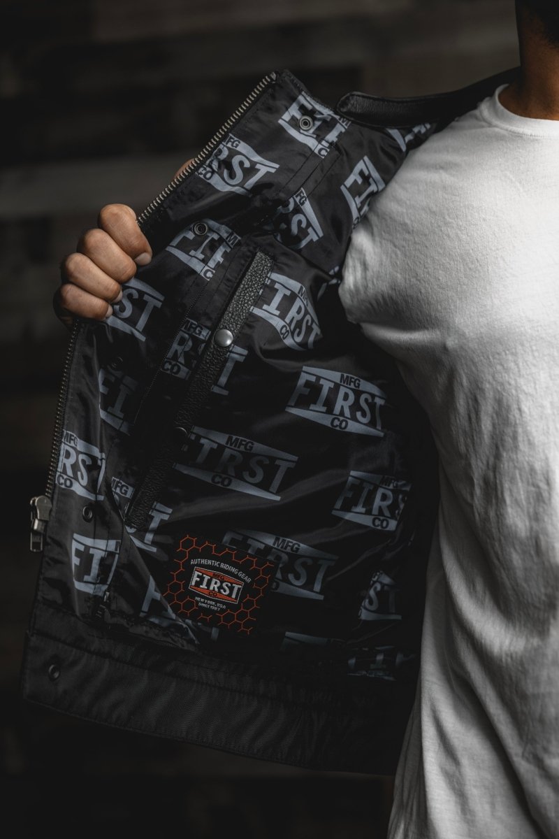 Here it is - our SIGNATURE vest! We took fan favorite features from many of our vests to create our favorite! This is a club style vest, with a one inch collar, a cropped center zipper for comfort, that's hidden by covered snaps. The shoulders feature our black double diamond stitching. Plenty of pockets, including two conceal carry pockets. The satin liner with FMCo logos is easy access - so you can just unzip to add patches or embroideries. And always, it's got our Lifetime Warranty!
