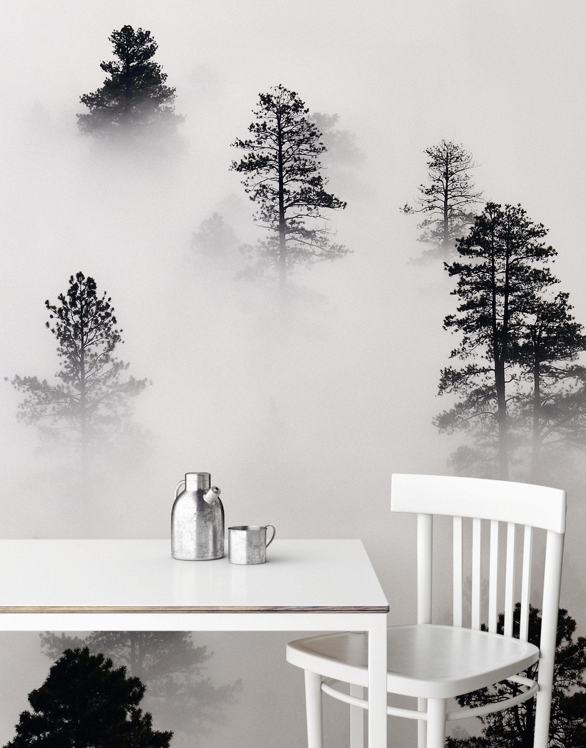 - Bring calmness into any room with this black and white forest wall mural.