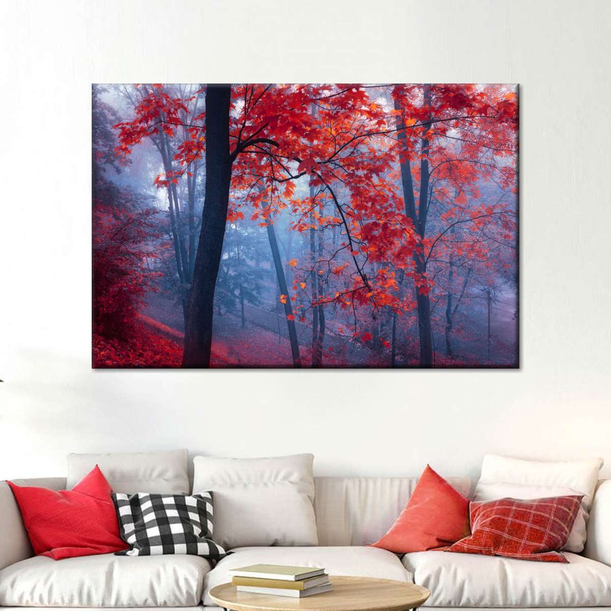 Foggy Red Maple Forest Wall Art will refresh your mind and soul whenever you stop and stare at it. This high-quality art print will complement any room in your home and soothe your senses with nature's beauty.