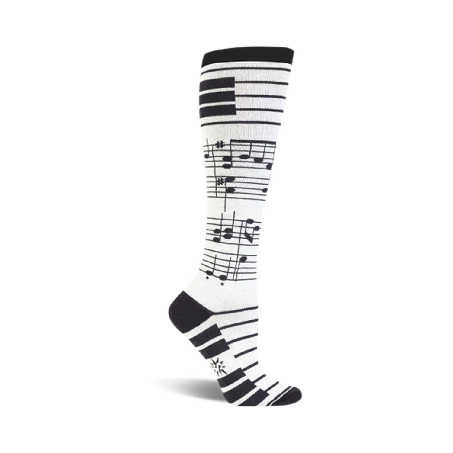 You've got some real music in your step. No, really! Look down at those awesome socks! Each cool pair of black and white knee high socks feature music notes and piano keys in great contrast. You'll be humming a tune everywhere you go. These fun feetwarmers belong in any piano lover's sock drawer.