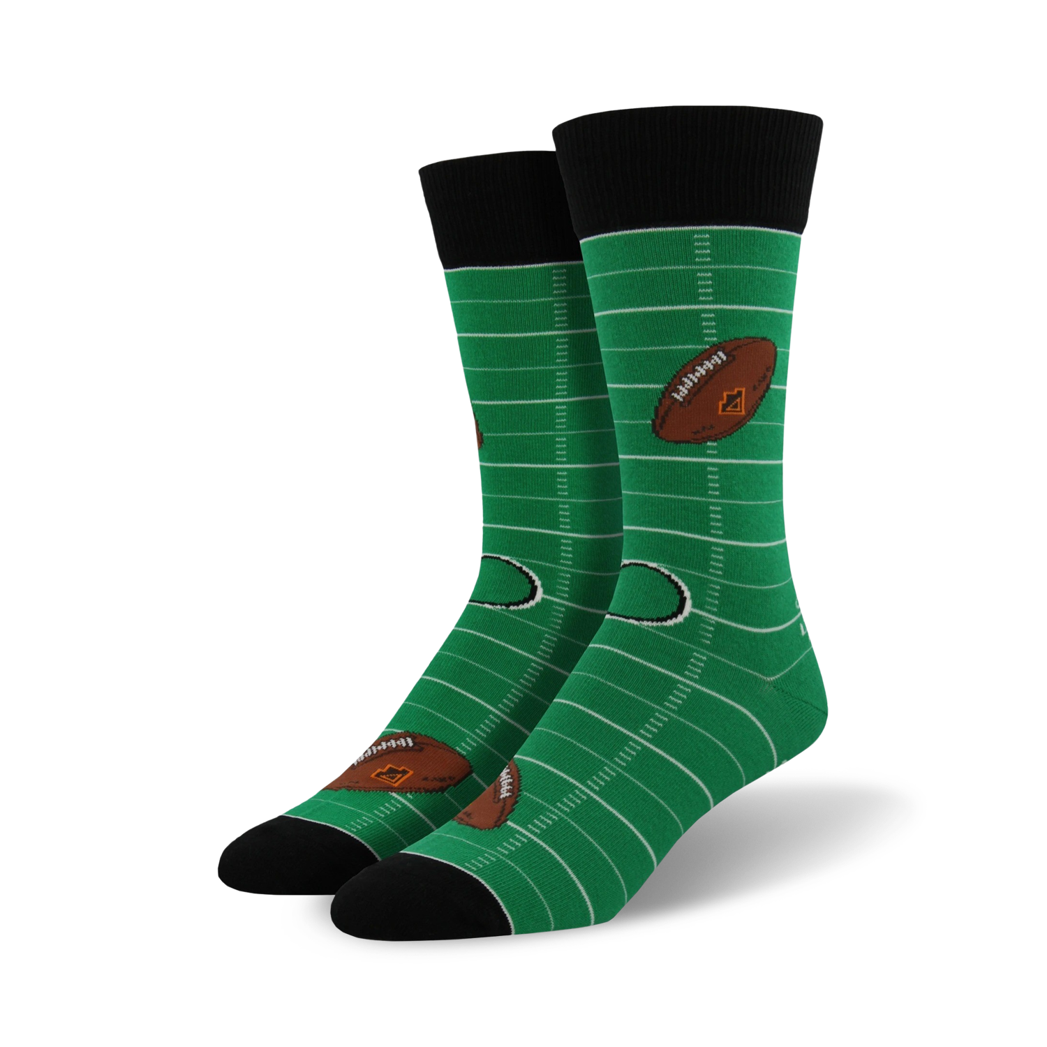 Blue 42, blue 42, hut, hut, HIKE! Get your game face on with the perfect footwear for the football season. These fun socks will go great with any jersey, no matter who you support. Each cool pair of these all green crew socks features a full football field layout complete with floating footballs.