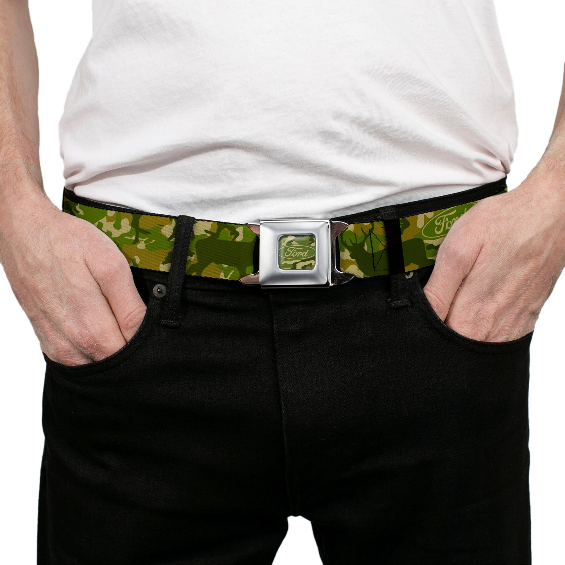 FORD Oval Full Color Deer Hunter Camo Olive Seatbelt Belt - FORD Deer Hunter Camo Olive Webbing