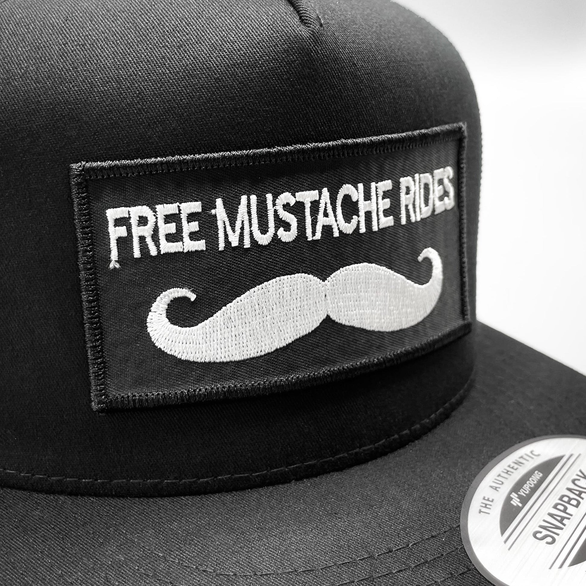 This listing is for a funny "Free Mustache Rides" embroidered patch on one of our best selling (and best fitting) baseball style trucker hats -- a black Yupoong 6006 Classic snapback trucker hat.