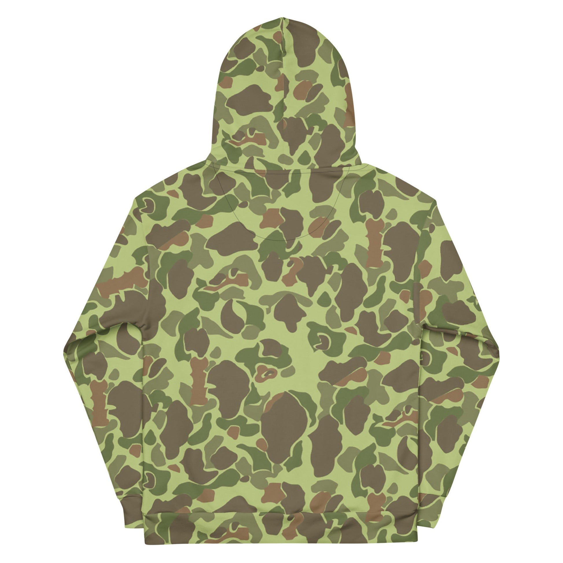 Cloak yourself with the Frog Skin Camo Hoodie, an homage to the amphibious military legacy. This vintage pattern, first adopted by the US Marines in WWII, is reimagined for today's wear. Merging utility with history, this hoodie is for those who carry the spirit of the past into the challenges of today. It's a salute to the old-school, a tribute to the bold.