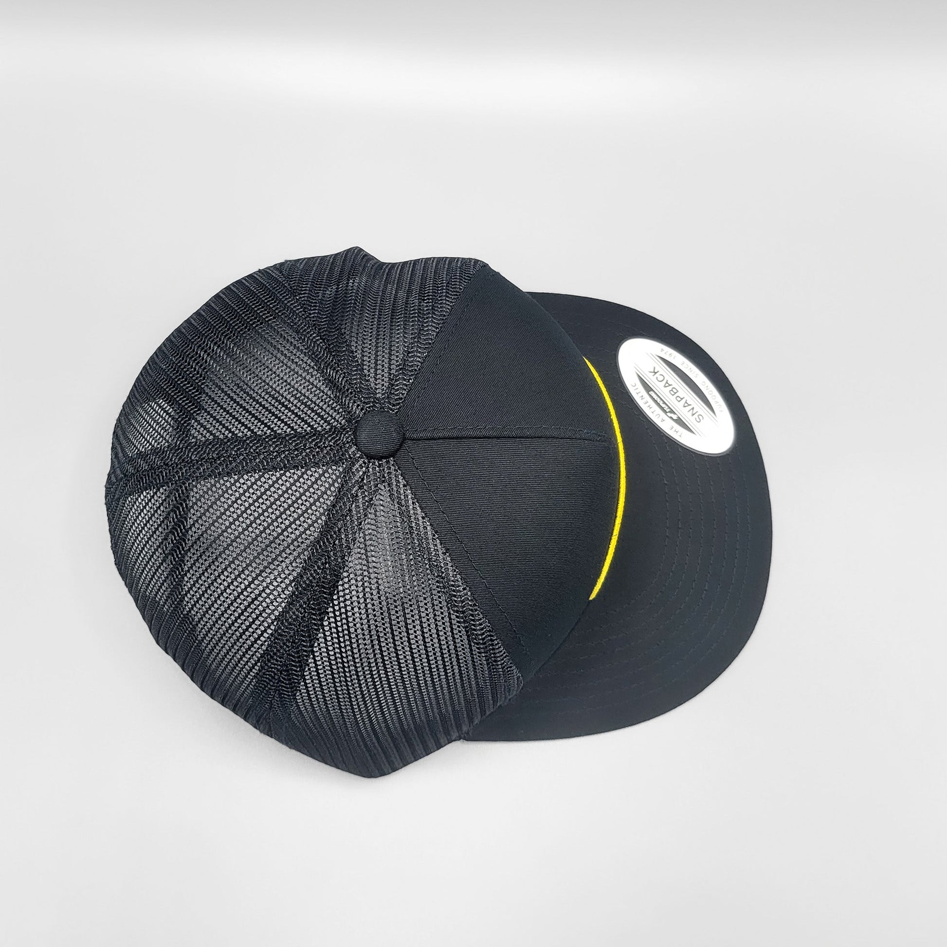 This Frontier Casino vintage trucker hat features a retro embroidered patch on all black, premium Yupoong 6006 Classic high-crown mesh snapback baseball cap.