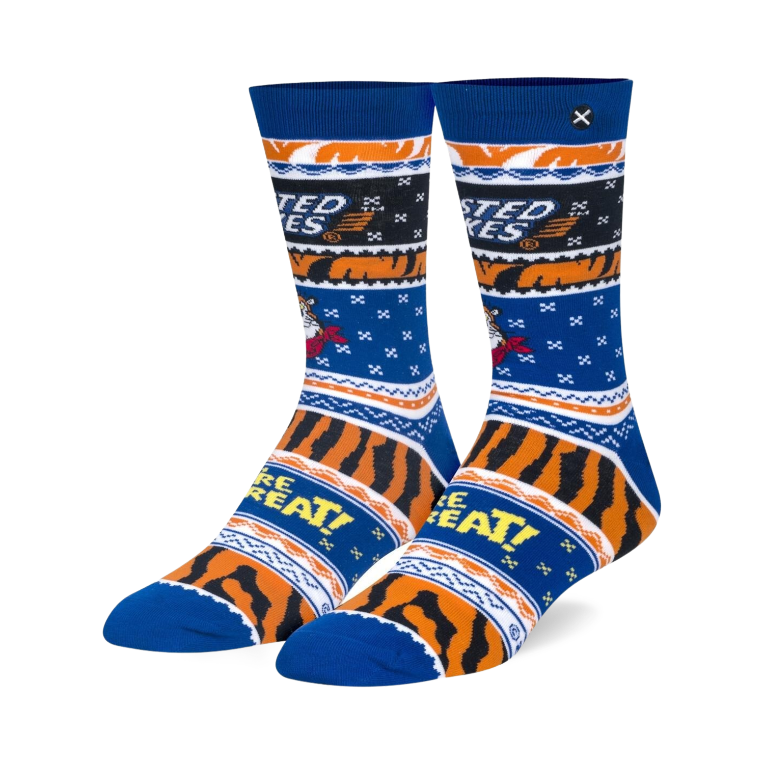 Feel the magic of Christmas with every step in these Frosted Flakes Ugly Sweater socks! Featuring Tony the Tiger in a Santa hat and snowflakes and Christmas trees sprinkled over brilliant blue snow drifts, they're a fantastic way to show off your holiday spirit. With reinforced heels and toes, and a ribbed cuff for a snug fit, these socks mean business! Grab your box of Frosted Flakes and get ready to jingle all the way with these joyous kicks.