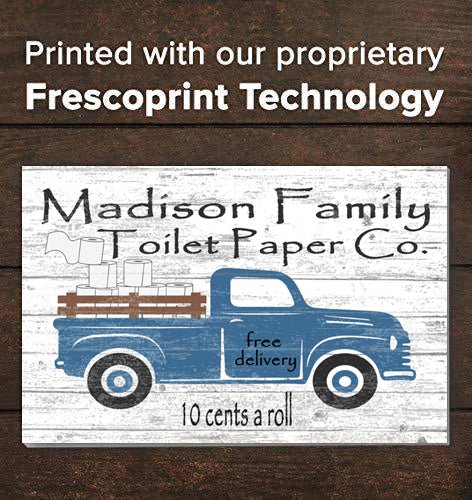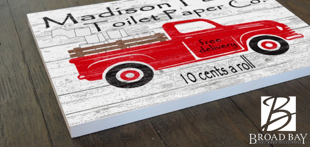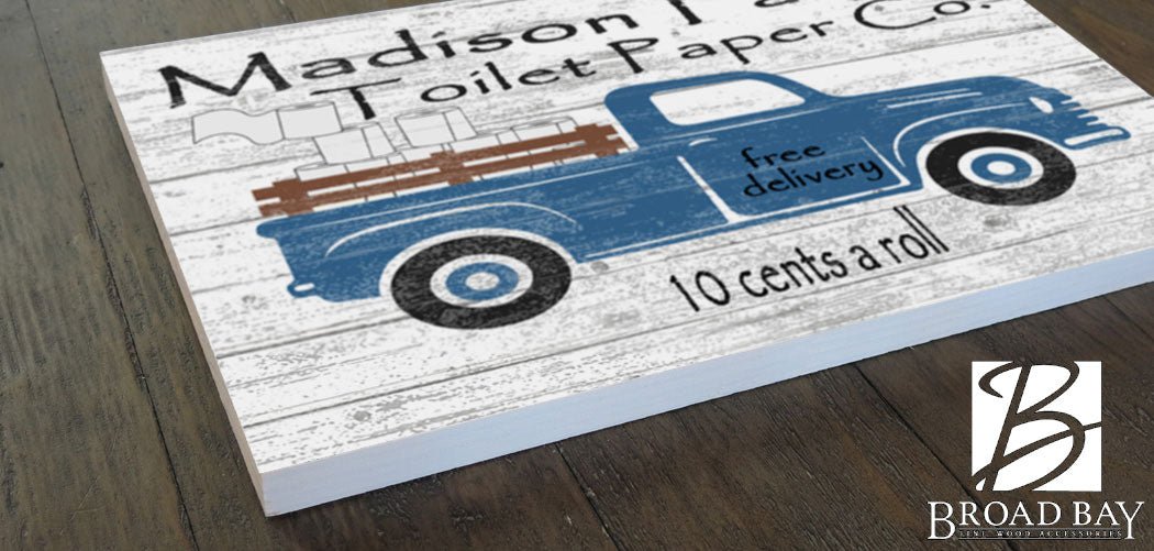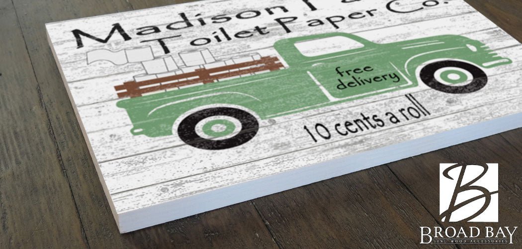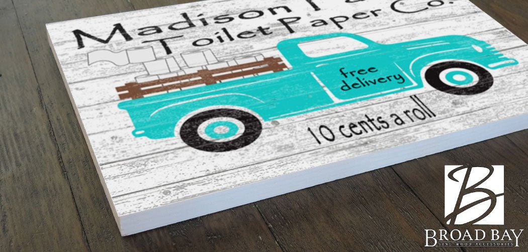 This unique Broad Bay personalized toilet paper delivery truck bathroom sign decoration makes a great customized housewarming gift. Broad Bay only uses solid wood for the highest quality bathroom home decor signs. Custom created daily in Virginia Beach, our personalized toilet paper delivery truck bathroom signs feature our unique Fresco Print process that actually embeds your custom bathroom design into the surface of the solid wood sign for a long lasting and vibrant appearance. Personalized fast, our customized bathroom decoration signs make the perfect bathroom theme home gift!