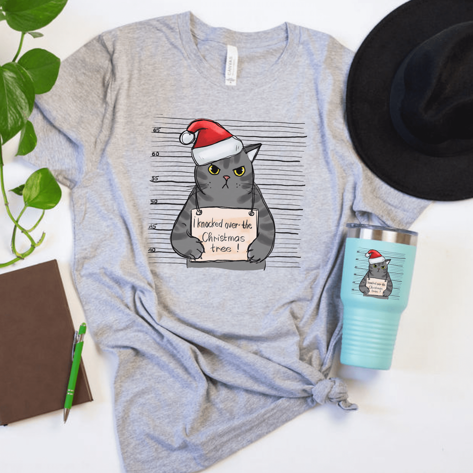 Anyone else have a cat that can't leave the Christmas tree alone? This t-shirt is hilarious and perfect for you! Design shows a grey cat in a Santa hat having its mug shot taken, holding a sign that reads, " I knocked over the Christmas tree."