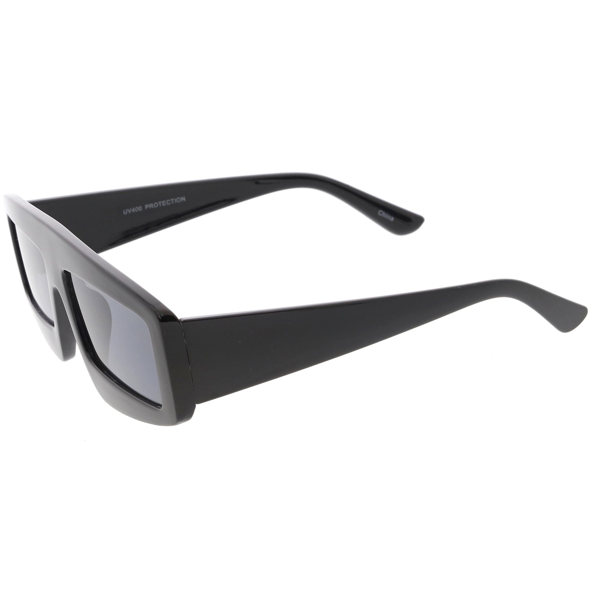 - Featuring an oversize shape, these futuristic rectangle sunglasses are designed with a chunky frame and stylishly wide arms. Contrasted with neutral colored lenses, these novelty sunglasses are a fun style to wear during summer. Made with a plastic based frame, reinforced metal hinges, and 100% UV protected lenses.