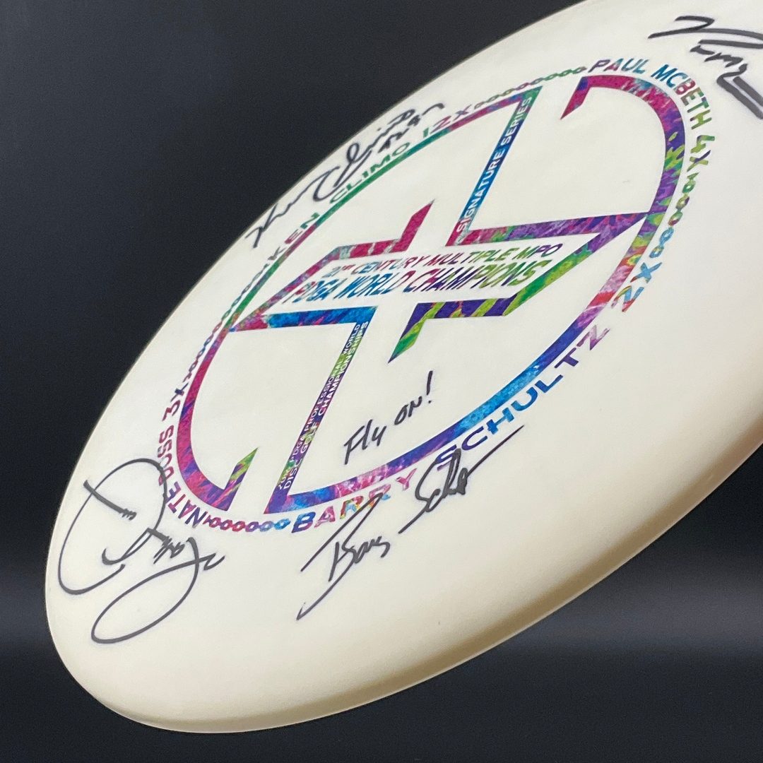 5/5/-1/1 *Signed by Ken Climo 12X, Paul McBeth 4X, Barry Schultz 2X, and Nate Doss 3X! Incredibly rare limited edition honoring the four multiple MPO PDGA World Champions of the 21st Century! Understamped with a mini 2016 PDGA Worlds stamp!