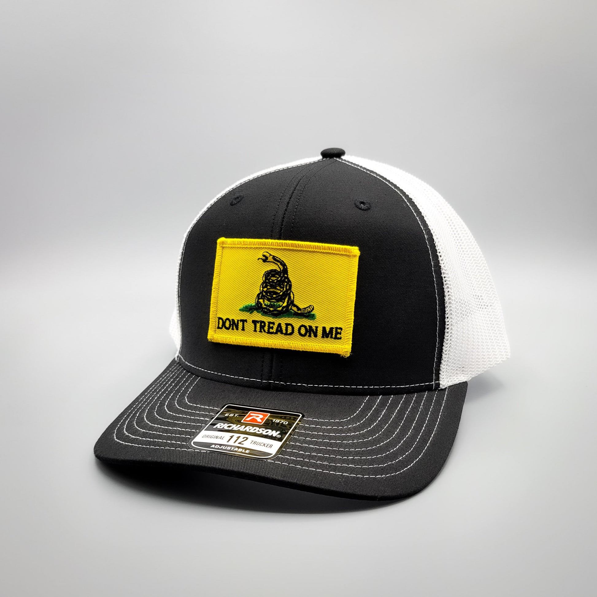 This trucker hat features an embroidered Don't Tread on Me Gadsden flag with a coiled rattlesnake patch on a black and white mesh premium Richardson 112 snapback baseball cap. Show and wear your patriotic spirit with this beautiful American pride hat!