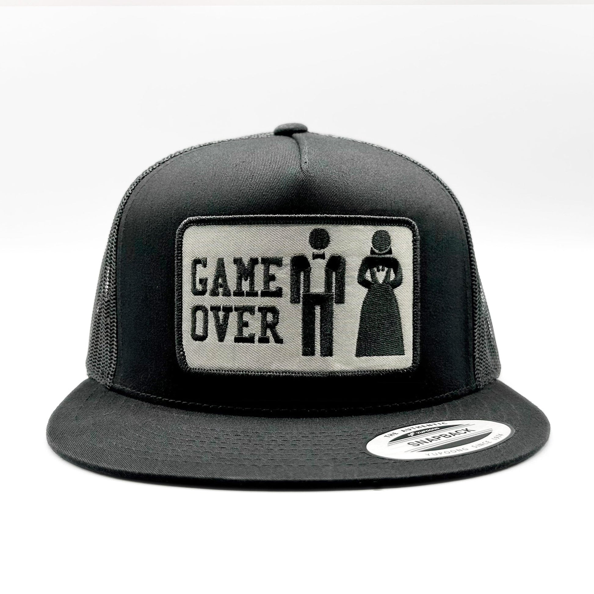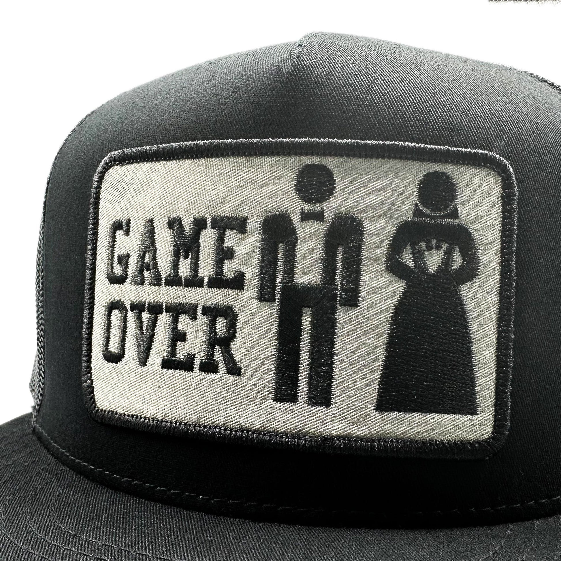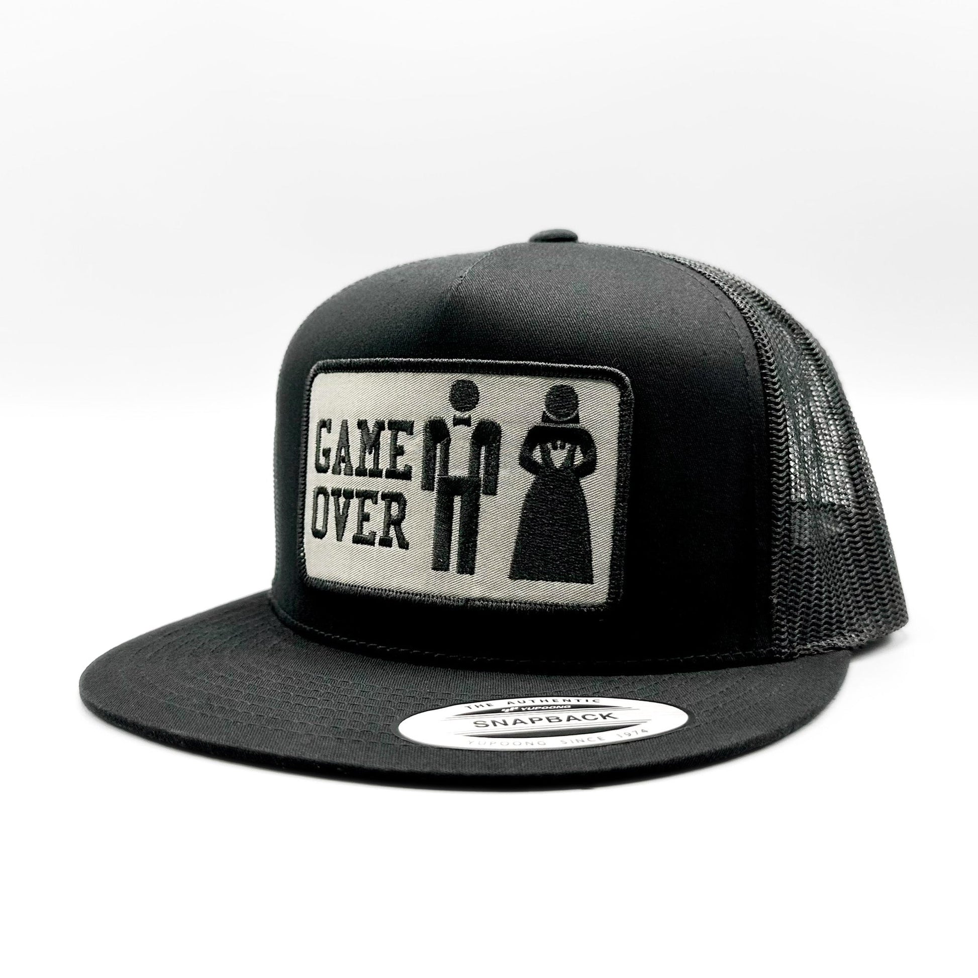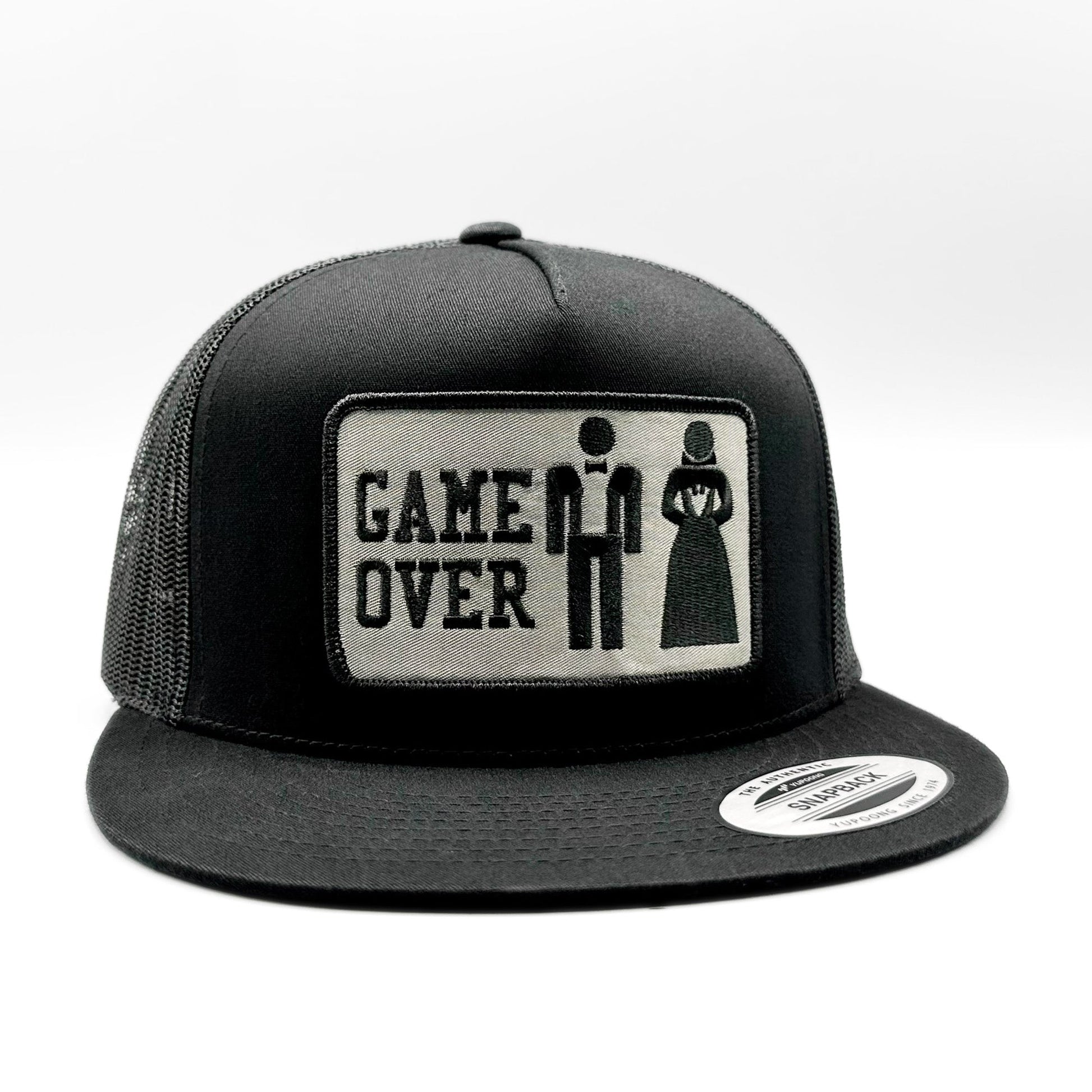 This listing is for a retro style "Game Over" embroidered patch on a black Yupoong 6006 Classic mesh snapback trucker hat.