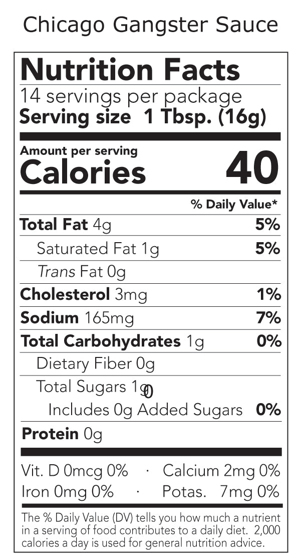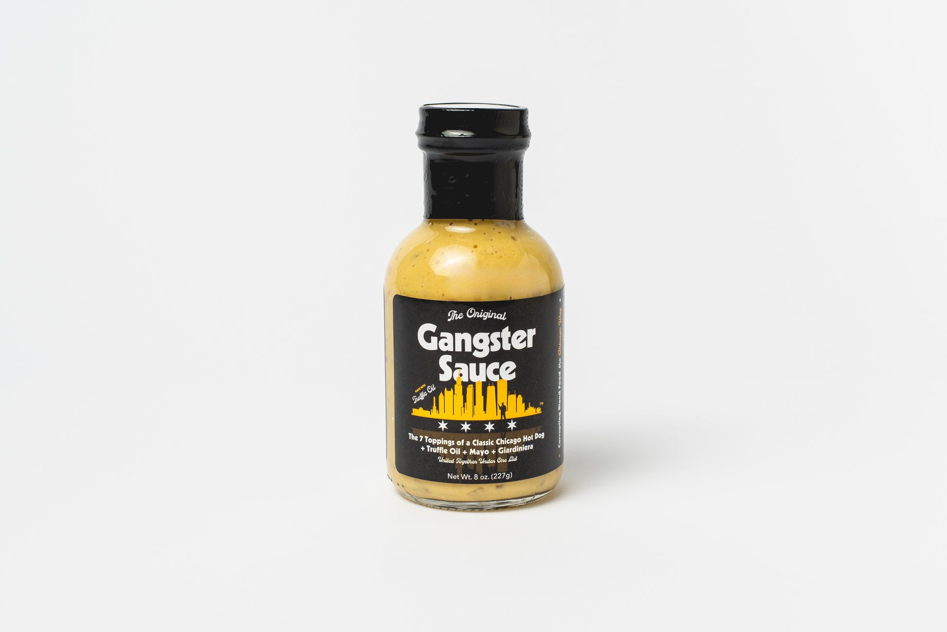 Chicago Gangster Sauce Ingredients: The Original Chicago Sauce (pickles, tomatoes, onions, yellow mustard, sweet relish, sport peppers, water, and celery salt), giardiniera, mayonnaise*, and truffle oil