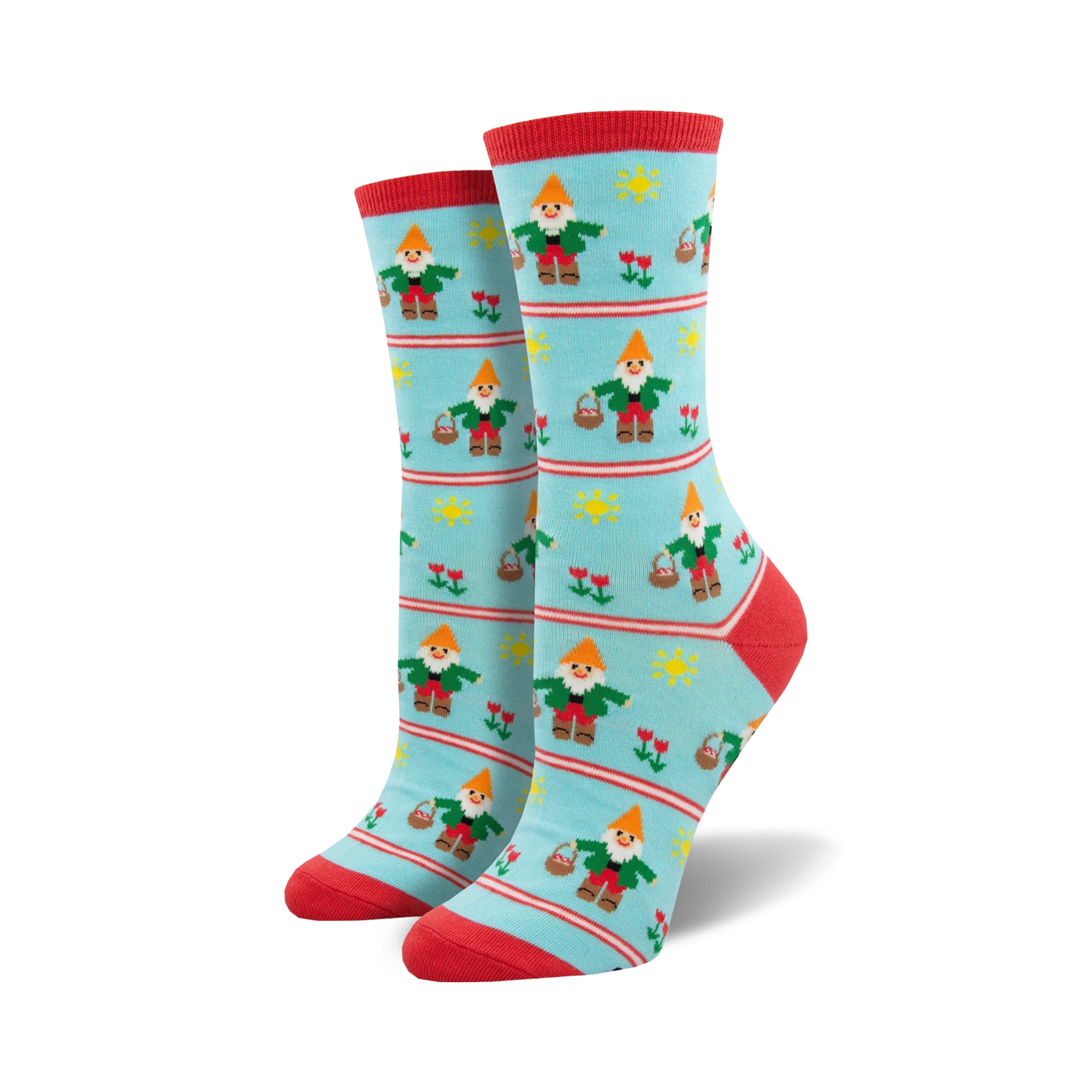 Garden gnome crew socks with red caps, green shirts, yellow baskets, red flowers, yellow suns, red tops with white stripes, and red bottoms. Quirky, comfy, and sure to bring a smile to your face.