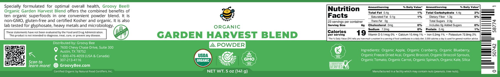 Groovy Bee® Organic Garden Harvest Blend Powder contains no gluten or GMOs and has been thoroughly lab tested for glyphosate, heavy metals and microbiology. It is also vegan and certified Kosher and organic.