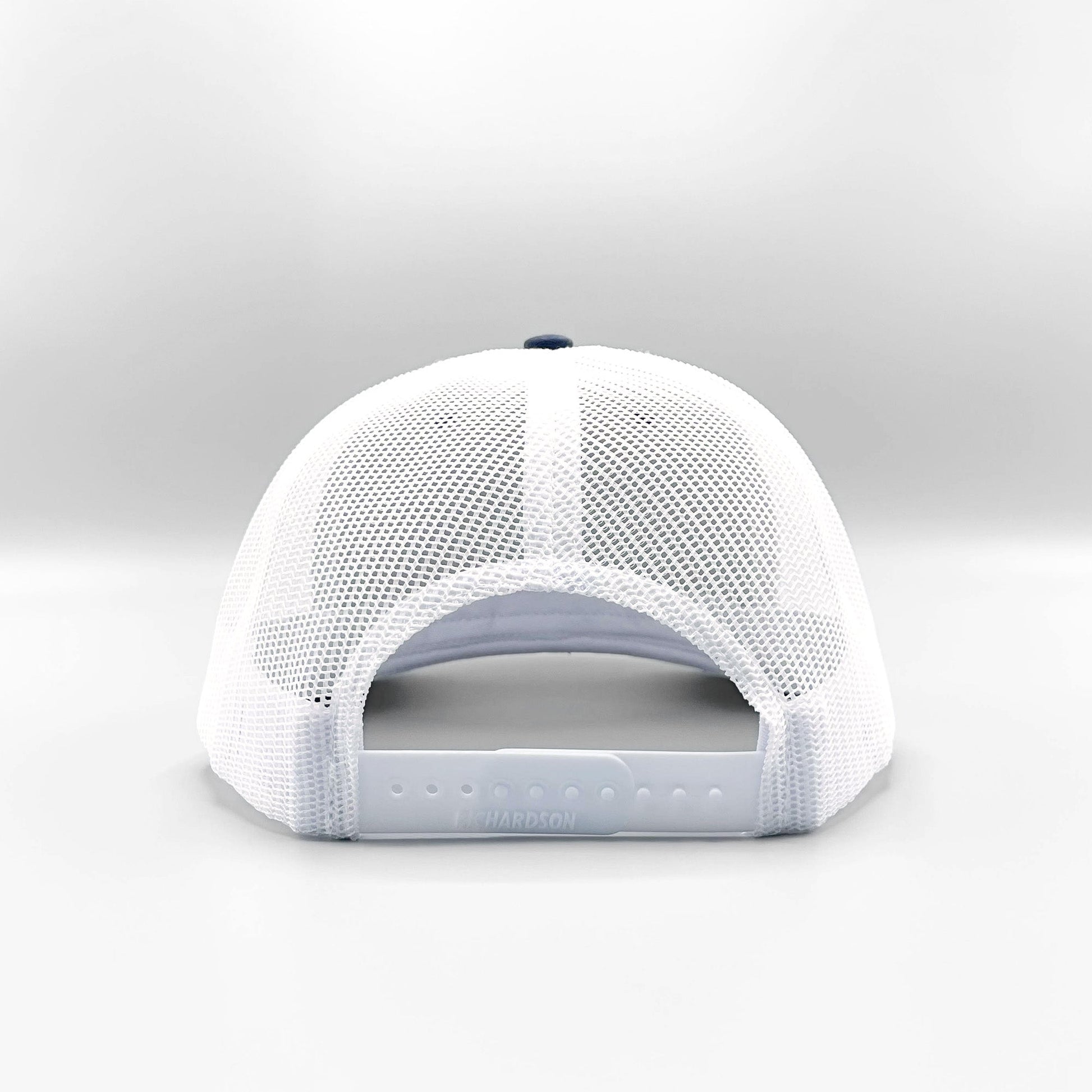 Get an retro Gator Ralph's Bait-n-Tackle fishing hat! This trucker hat features gray, white and olive embroidered fishing patch on a navy blue and white mesh premium Richardson 112 snapback baseball cap.