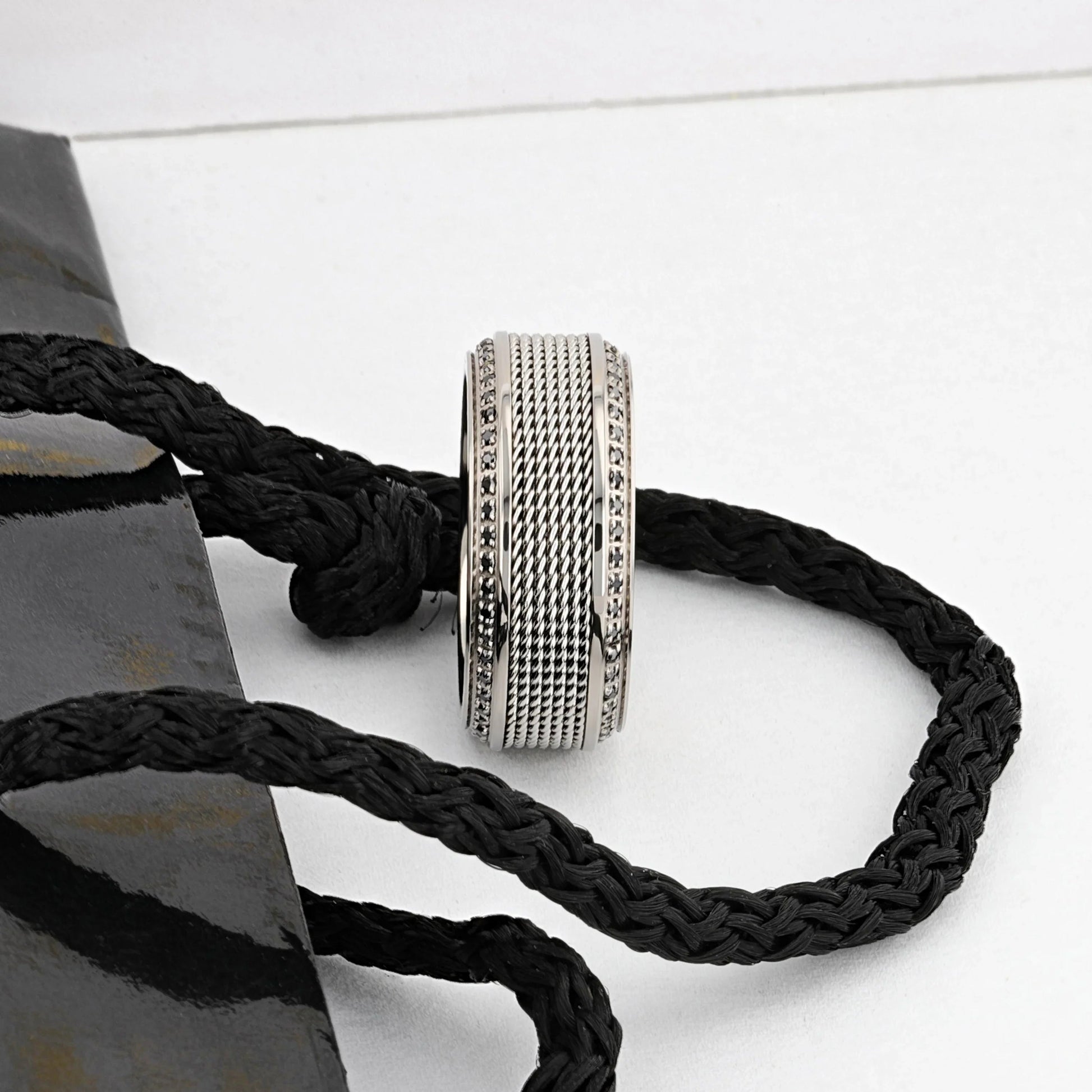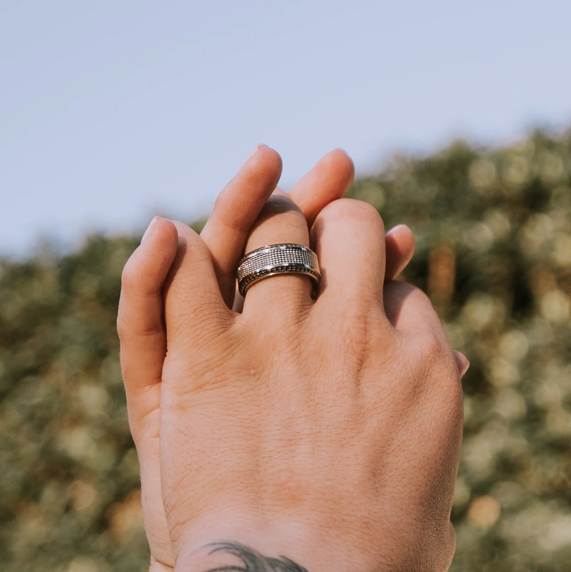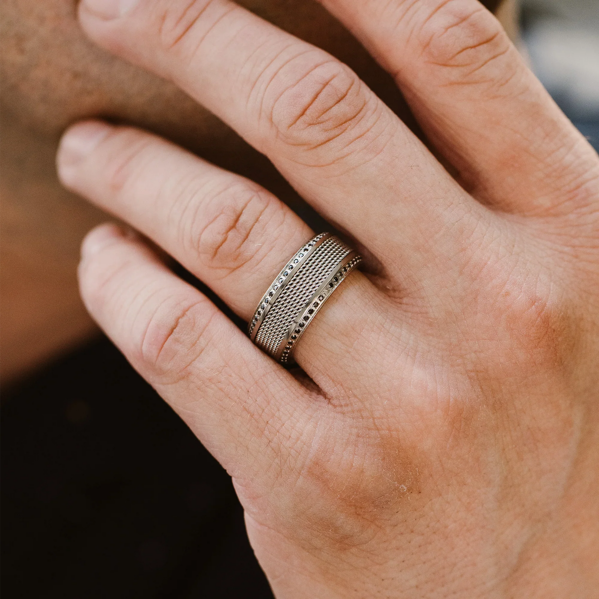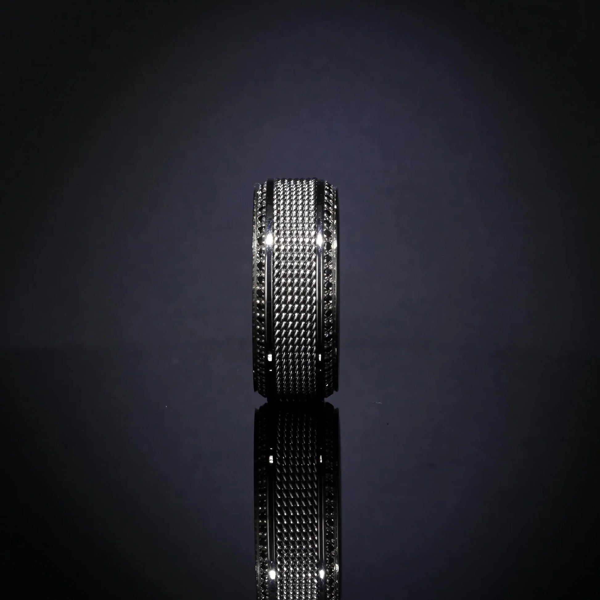 Featuring a steel chain center, GAUNTLET is a great choice for those who seek a unique band. Featuring 0.5 total carats of black diamonds along the beveled edges of a titanium band, this ring offers exceptional durability to match your lifestyle.
