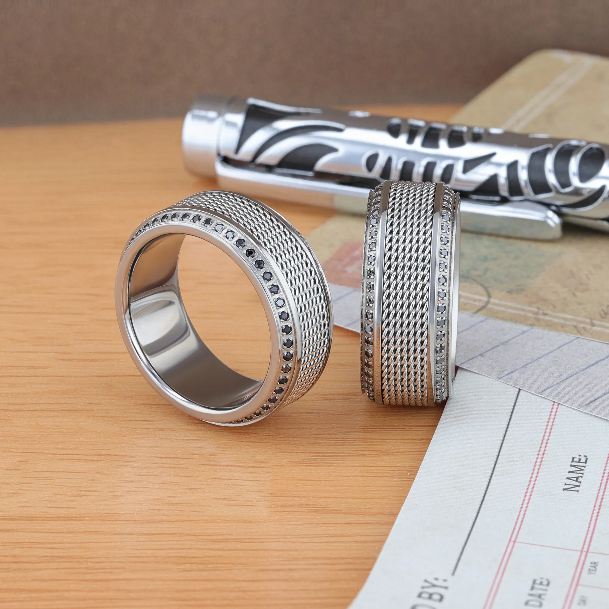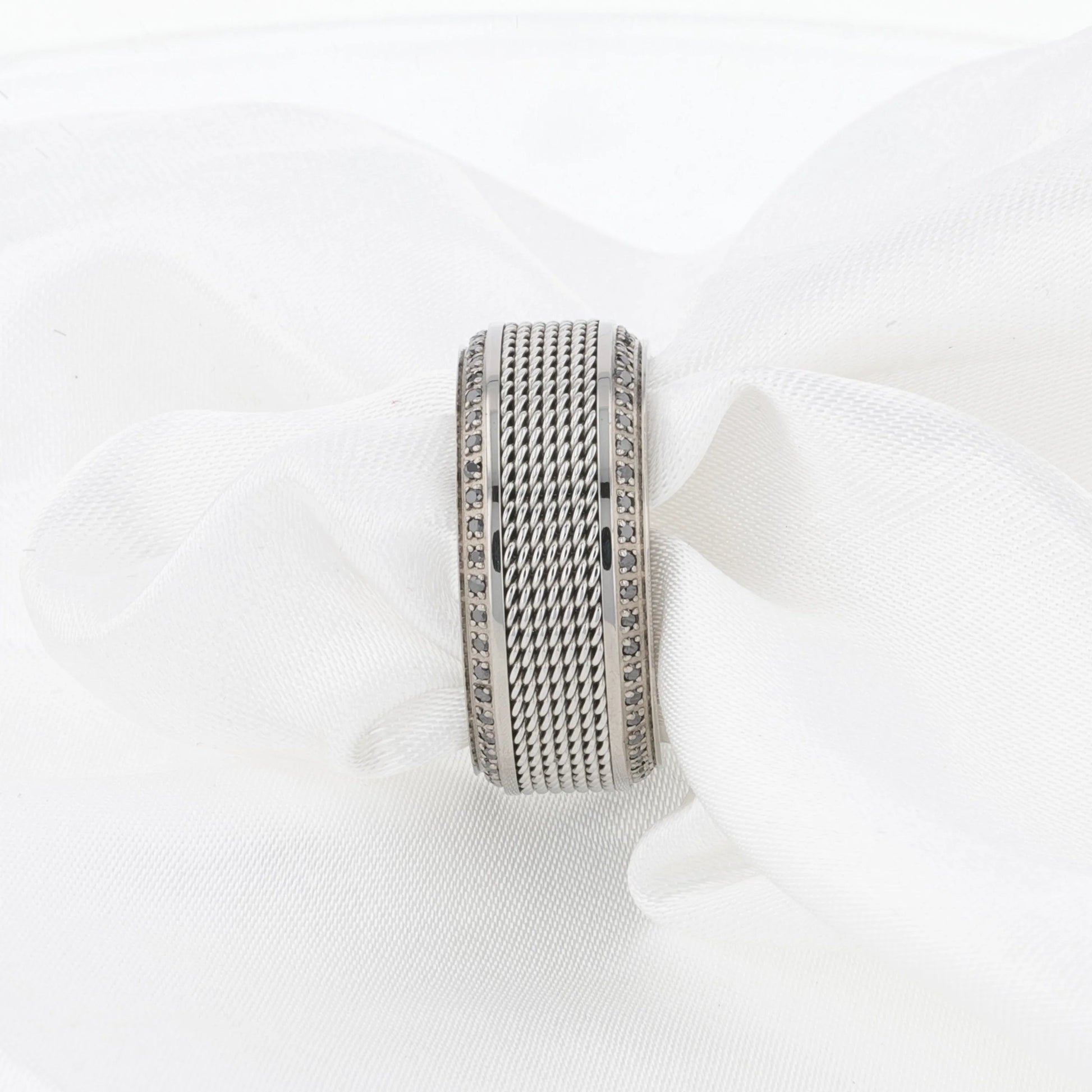 GAUNTLET Steel Chain Titanium Wedding Ring Polished Beveled Edges Set with Round Black Diamonds - 10mm