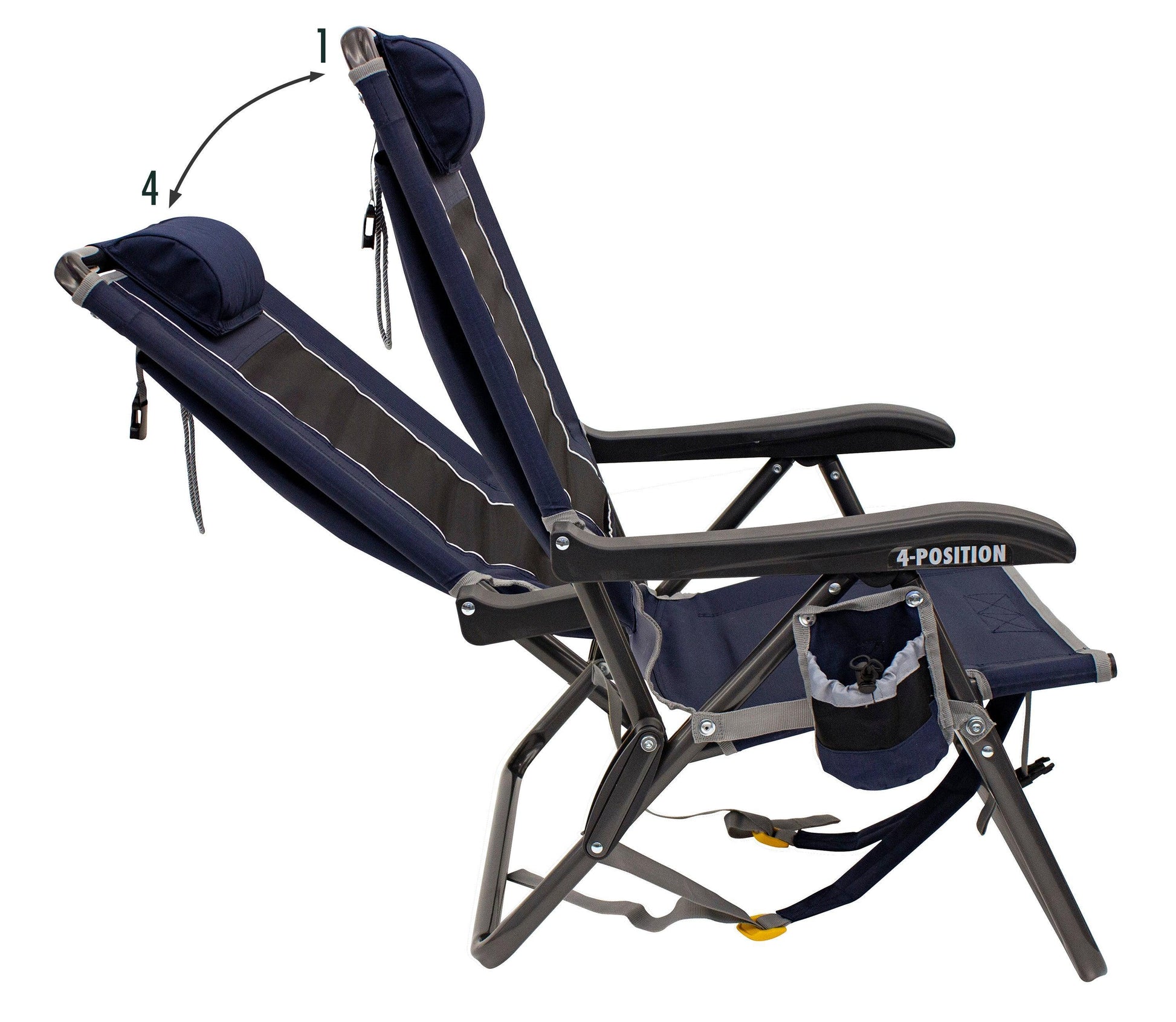 Quality Construction: This foldable chair boasts a built-in beverage holder, a comfortable head pillow, and ventilated seating complete with mesh paneling.