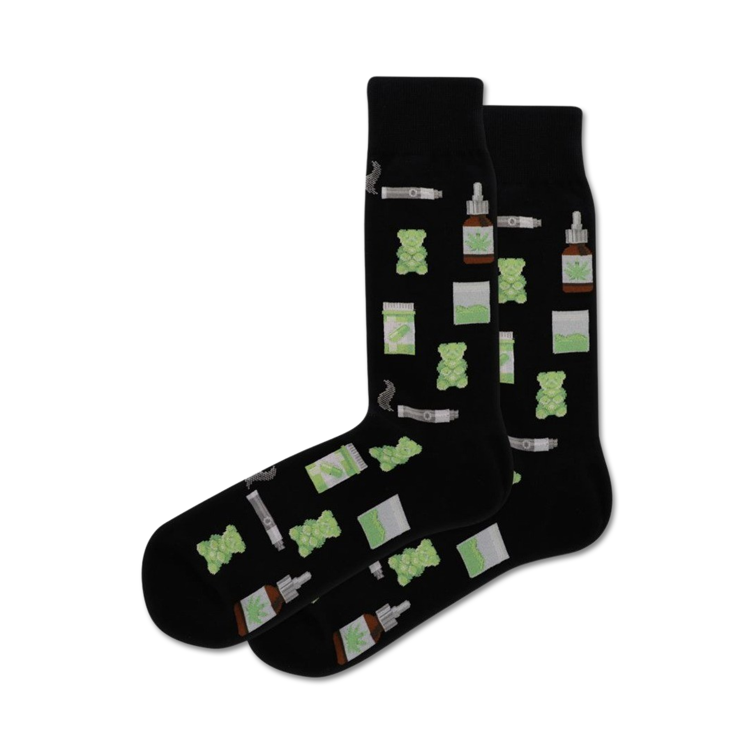 Put your feet on the road to relaxation with these "Get High" socks! Black and covered in a friendly pattern of green marijuana leaves, white pills, green pills, gray lighters, and brown lighters, these socks are like taking a vacation for your feet. Whether you want to display your personal brand of humor, take a break from the serious sock styles, or simply bring a little humor to your day, these socks are sure to be a conversation starter. Get high on life, and get high on socks!