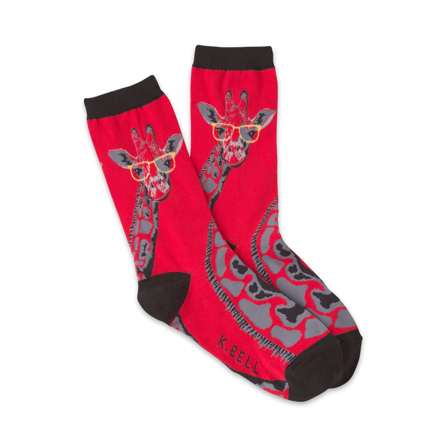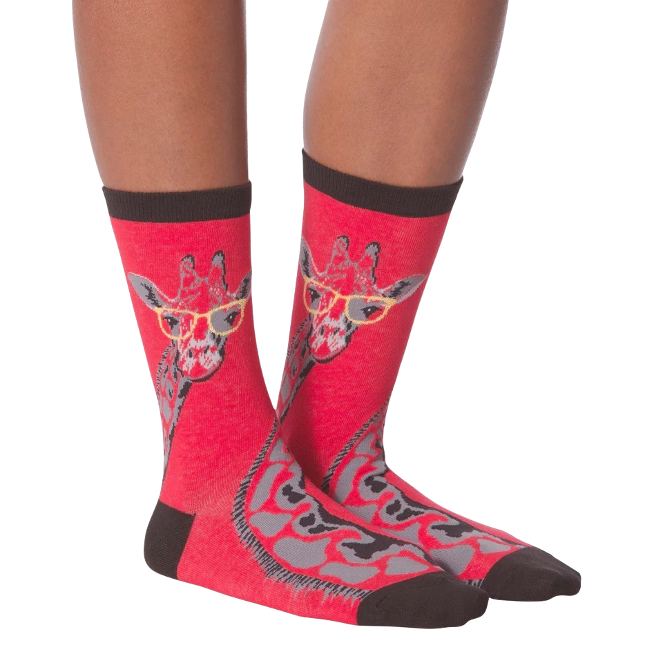 Giraffe with Glasses socks are the height of fashion, with a stylish pattern of giraffes sporting some shades. Featuring a bright red background, these cotton blend socks feature gray and black giraffes with black glasses. The black toe and heel add a touch of sophistication, while the gray cuff keeps your ankles cozy. Let these socks put a smile on your face and let the world know you're not afraid to stand out! Who knew giraffes could be so fly?
