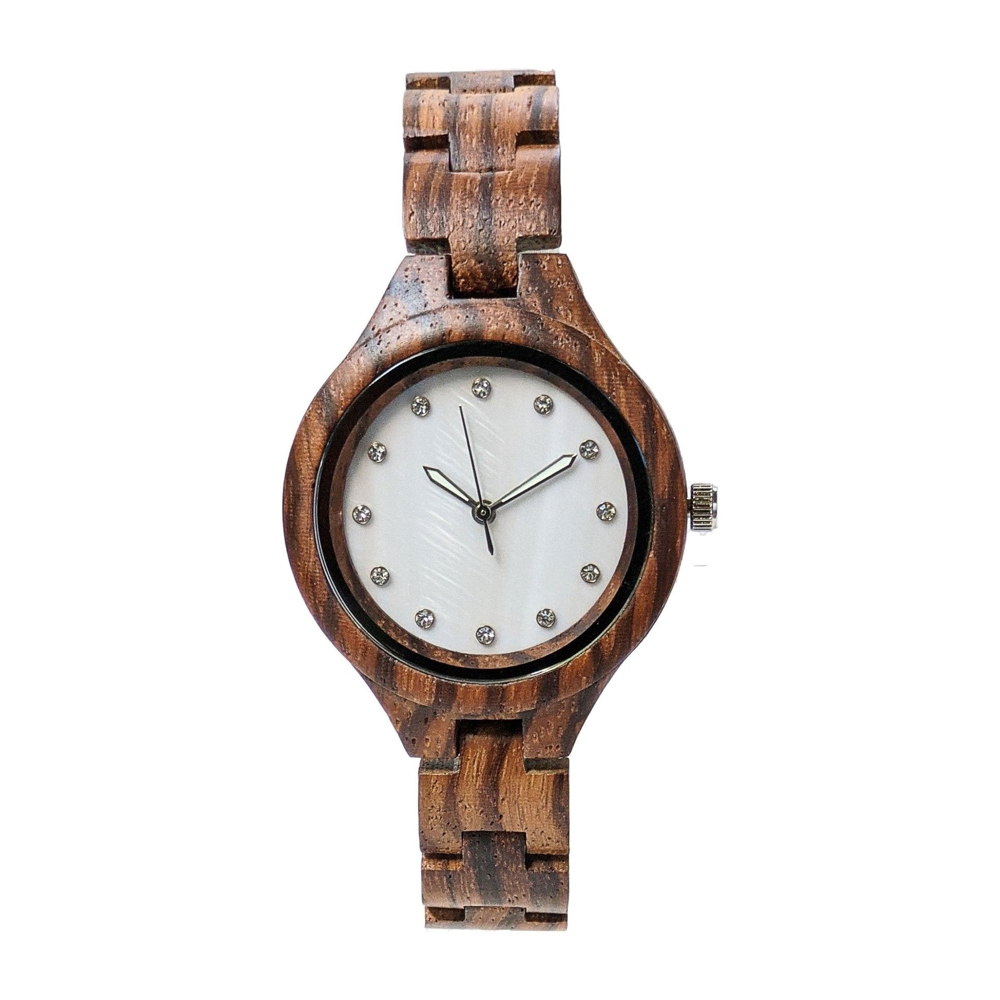 This stunning women's wood watch features a pearl dial that is dotted with crystal hour markers. It is the perfect watch for that glamorous look which transcends the time stamp. This timepiece speaks to females who possess exquisite taste. The sleek design coupled with luminous hands will certainly draw attention to this gorgeous wooden watch.