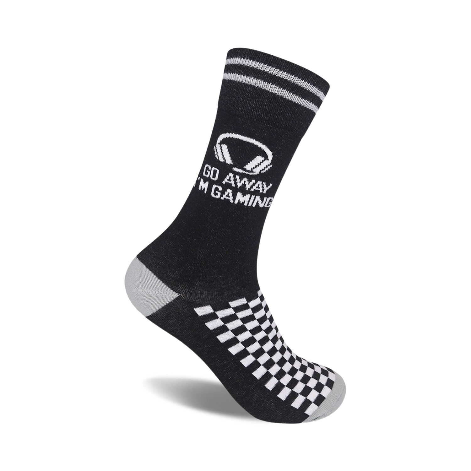 **Go Away I'm Gaming Socks Description:** Get ready to level up your sock game with our epic 'Go Away I'm Gaming' socks! These black beauties feature white text that screams 'GO AWAY I'M GAMING', letting everyone know you're on a serious gaming mission. Complete with a white and gray checkered pattern and two gray stripes, these socks will make you the envy of your gaming squad. Grab a pair and let the world know to stay away - you're too busy saving the pixelated universe.