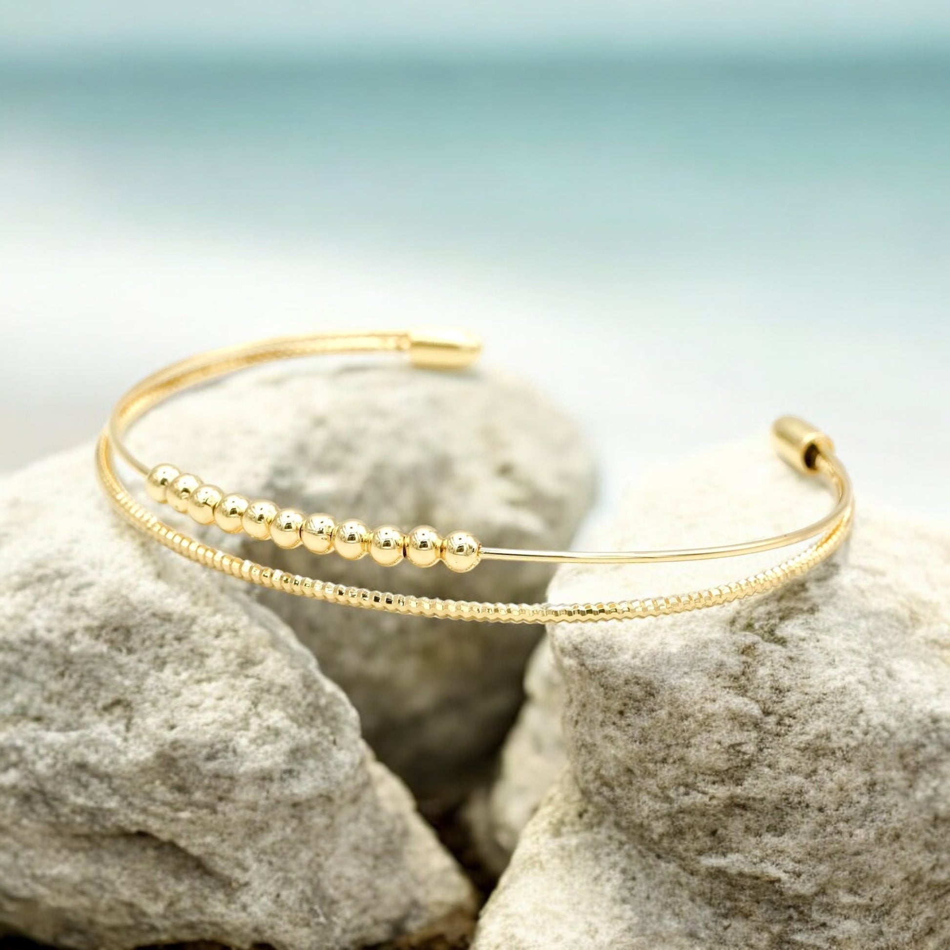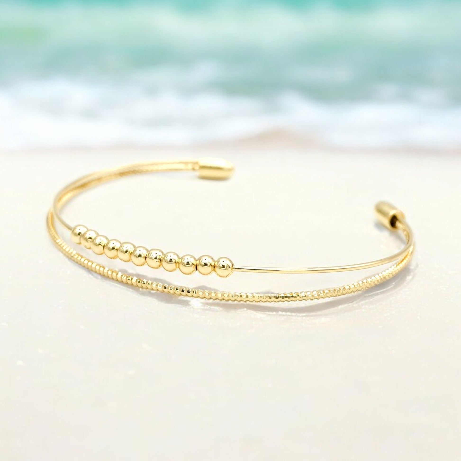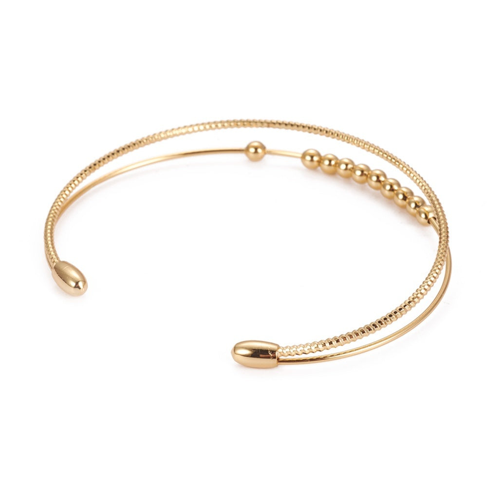 This beautiful double-strand bracelet is lightweight, bendable, and shiny, making it comfortable to wear. It is gold-plated, ensuring it maintains its stunning shine, especially when kept away from water. This bracelet is perfect for complementing our tile bracelets, but it also makes a great statement piece on its own.