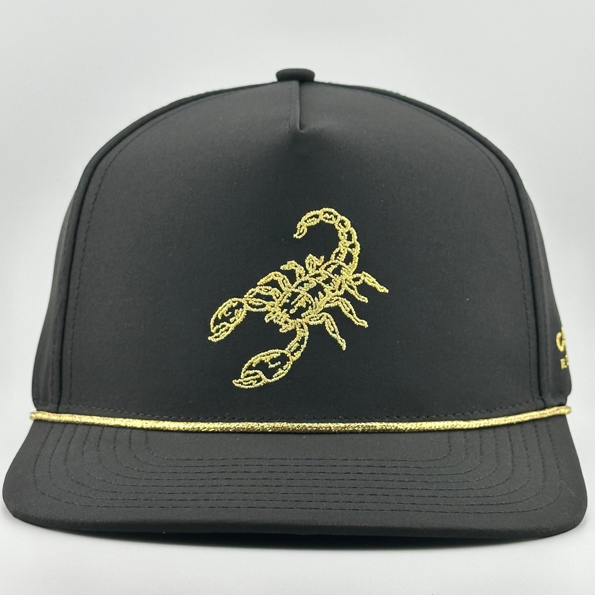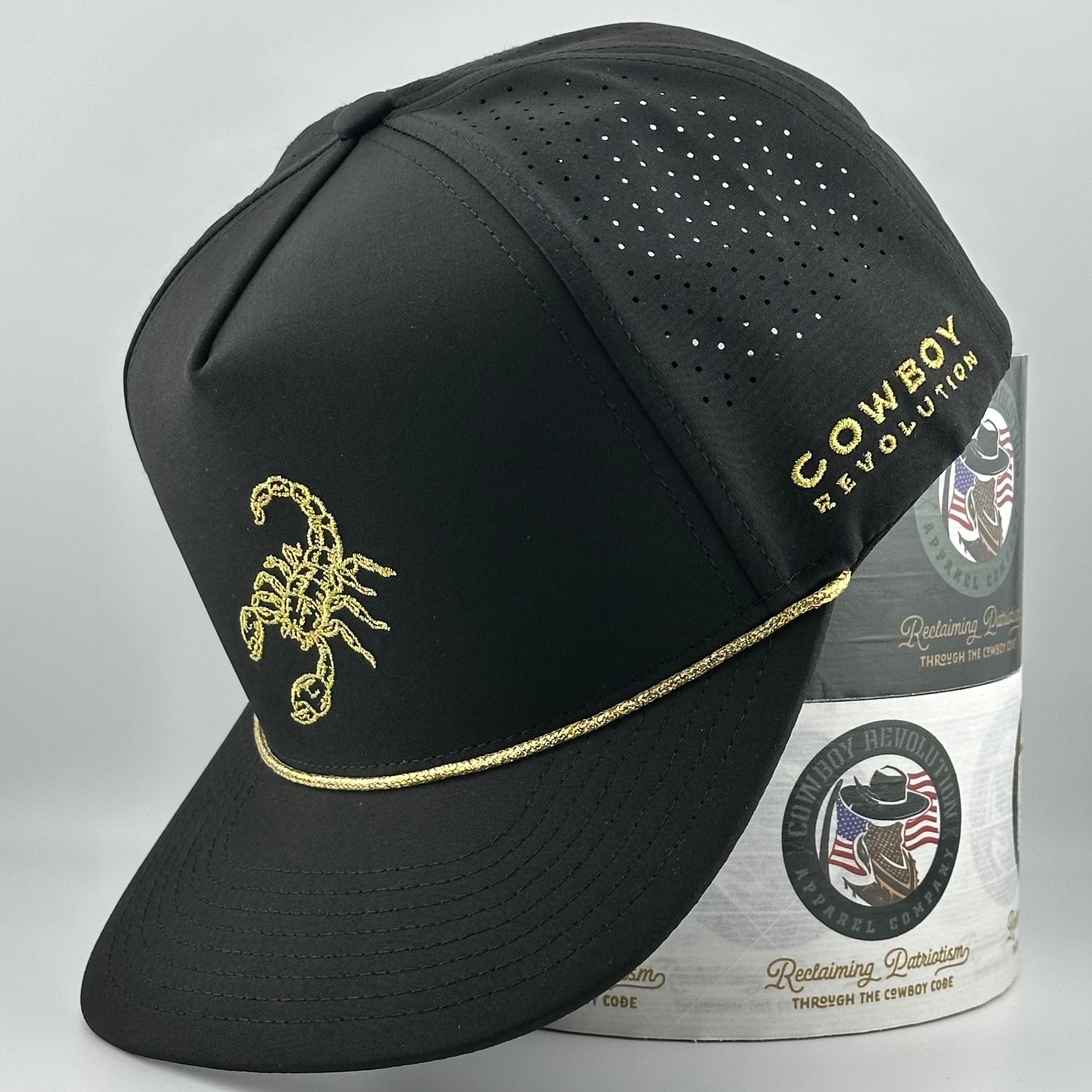Inspired by the timeless fable of the scorpion and the frog, the "Golden Scorpion" Performance Rope Hat from Cowboy Revolution Apparel Co. embodies bold instinct and unyielding spirit. Crafted from sleek black performance fabric with striking metallic gold accents, this structured, 5-panel hat features a high-crown silhouette with a signature metallic gold rope detail across the semi-curved brim—channeling the scorpion’s fierce, untamed nature. The adjustable snapback ensures a secure, personalized fit, while the breathable, moisture-wicking design keeps you cool and comfortable, whether you’re ruling the ranch or braving the wild.