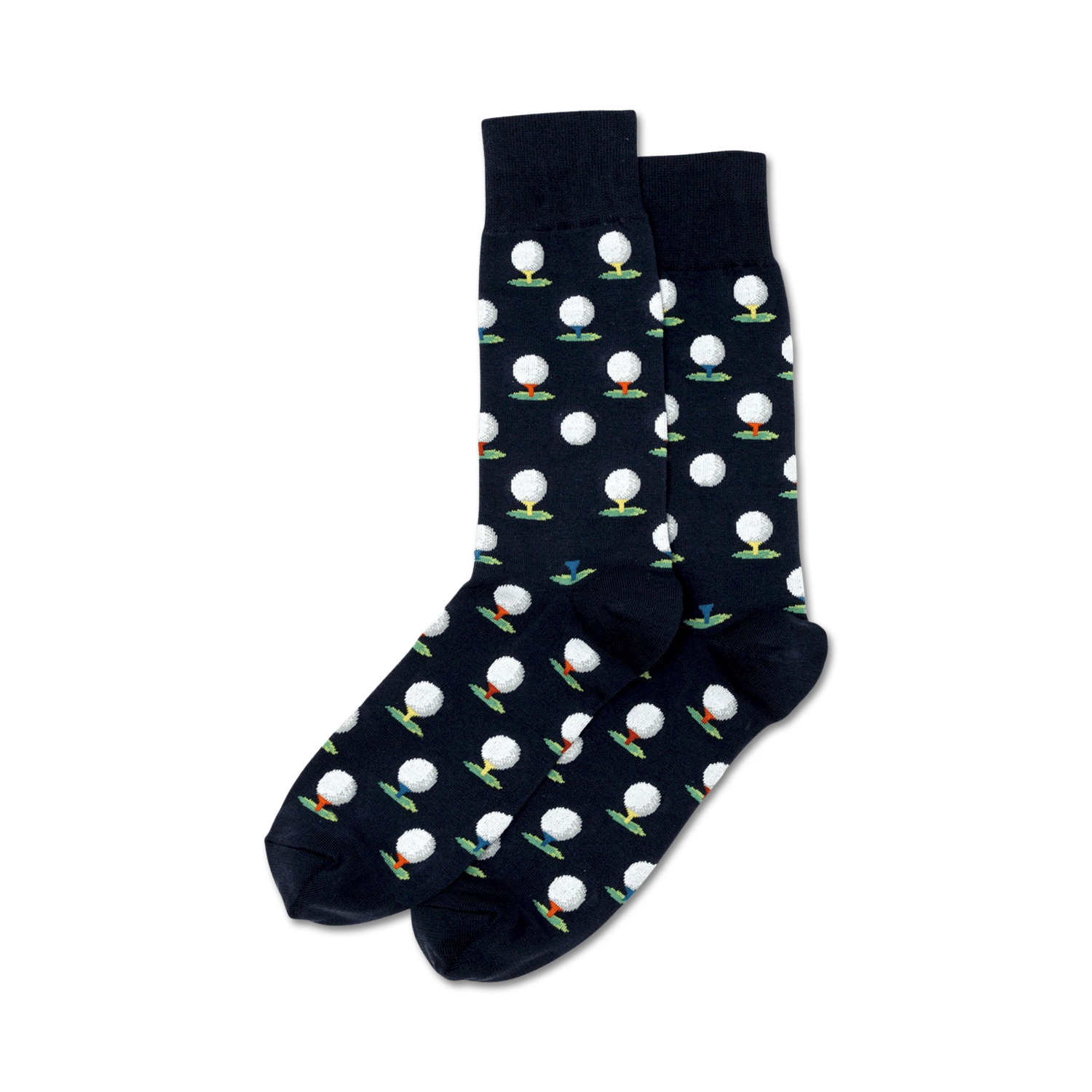 Golf Balls in your sock drawer? Putt them on and get in the game! These dark blue, mid-calf socks are just your style, featuring a pattern of golf balls in red, green and yellow. And who knows, maybe they'll give you a hole-in-one!