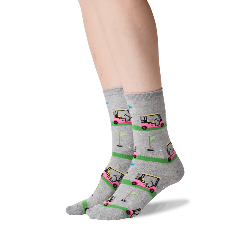 Get ready to hit the links with our fashionable and fun "Golf Cart" women's crew socks! These socks feature an exciting print of pink golf carts with yellow and white accents. Putt your best foot forward as you stride toward victory on the putting green. The socks are the perfect accessory for any golfing enthusiast.