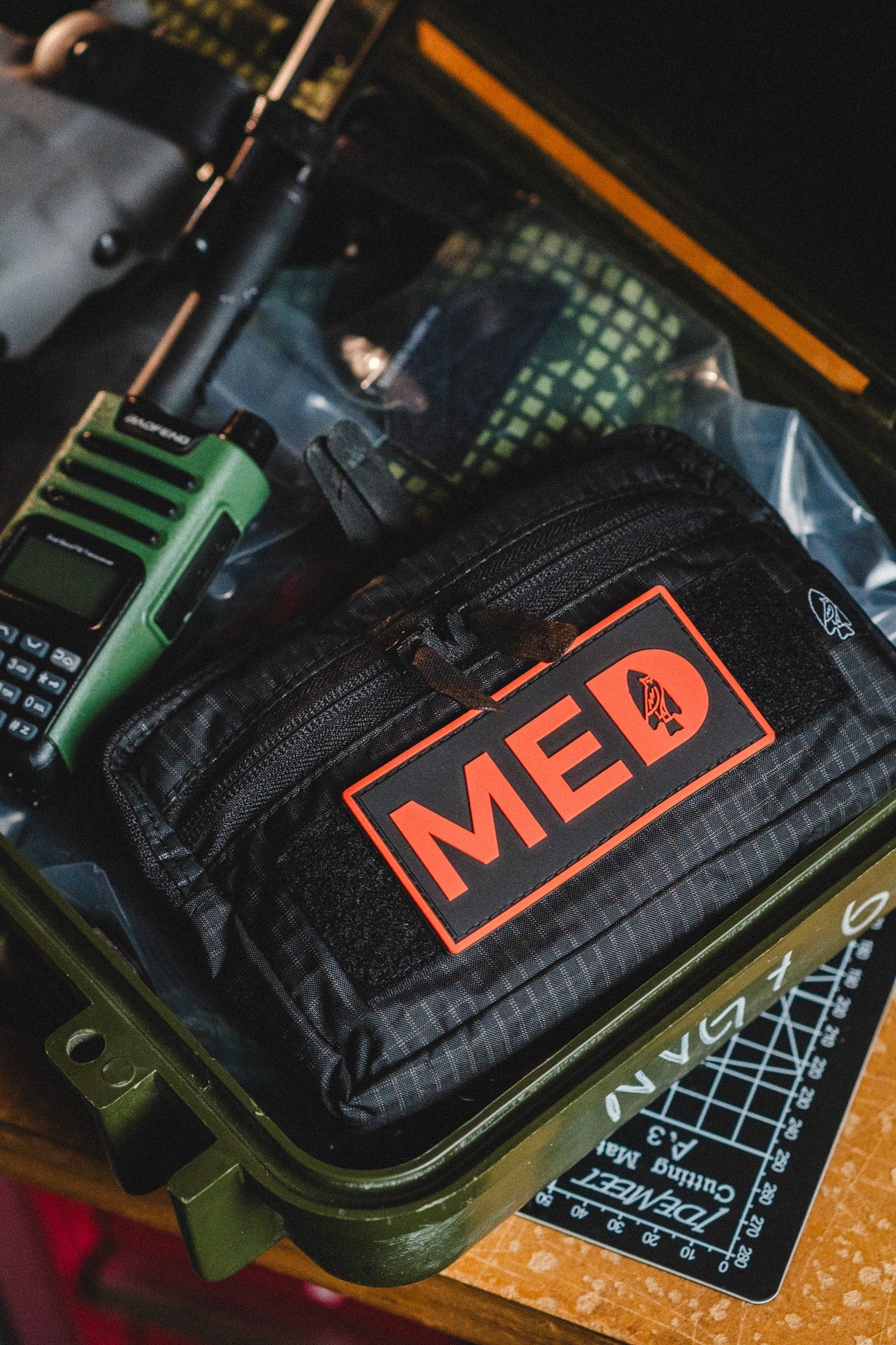 This is a very slim pouch made with 500D Cordura. It features reverse YKK zipper pulls on both the main and front pockets, and loop tape on both the front and back interior of the main pouch to accommodate battery and other organizational inserts.