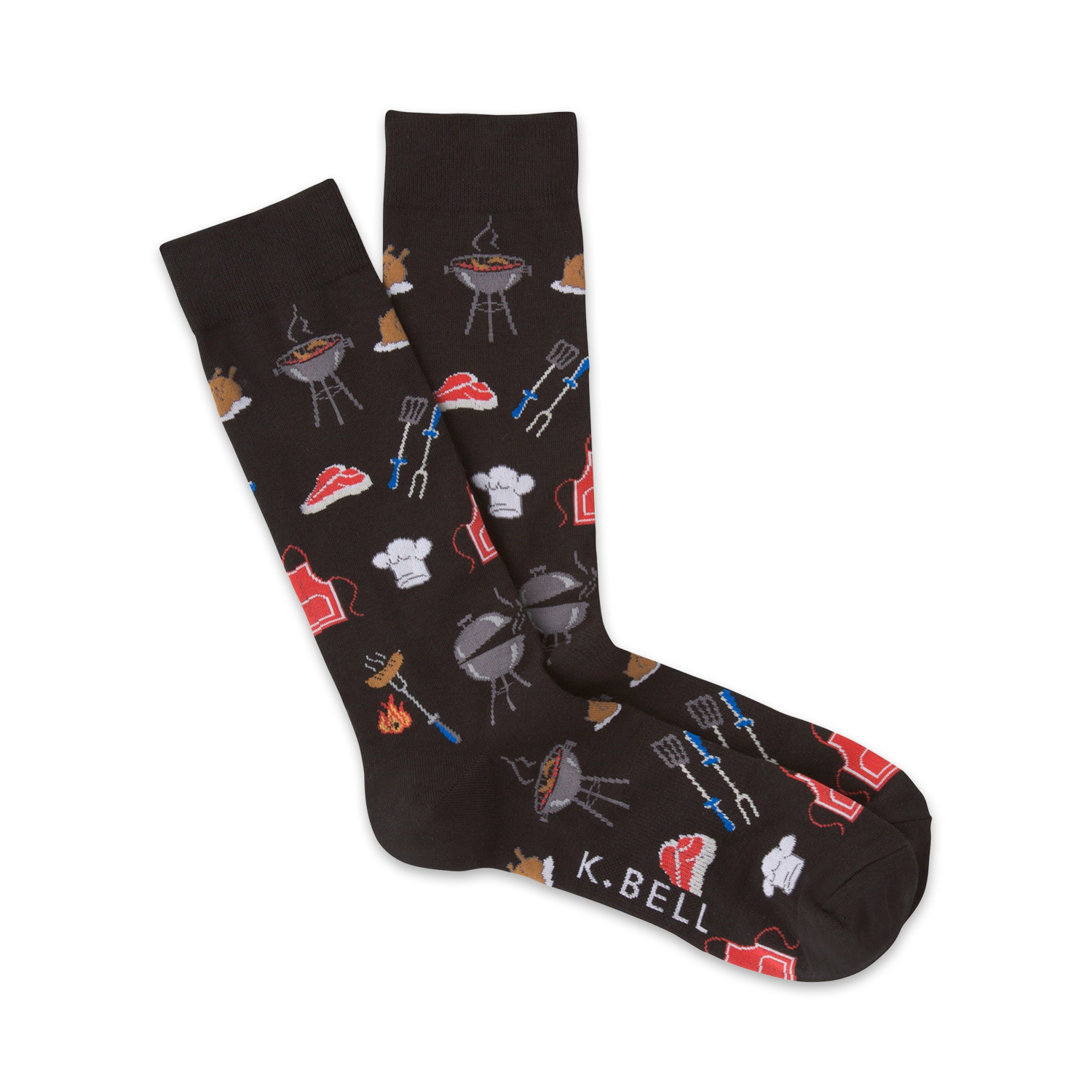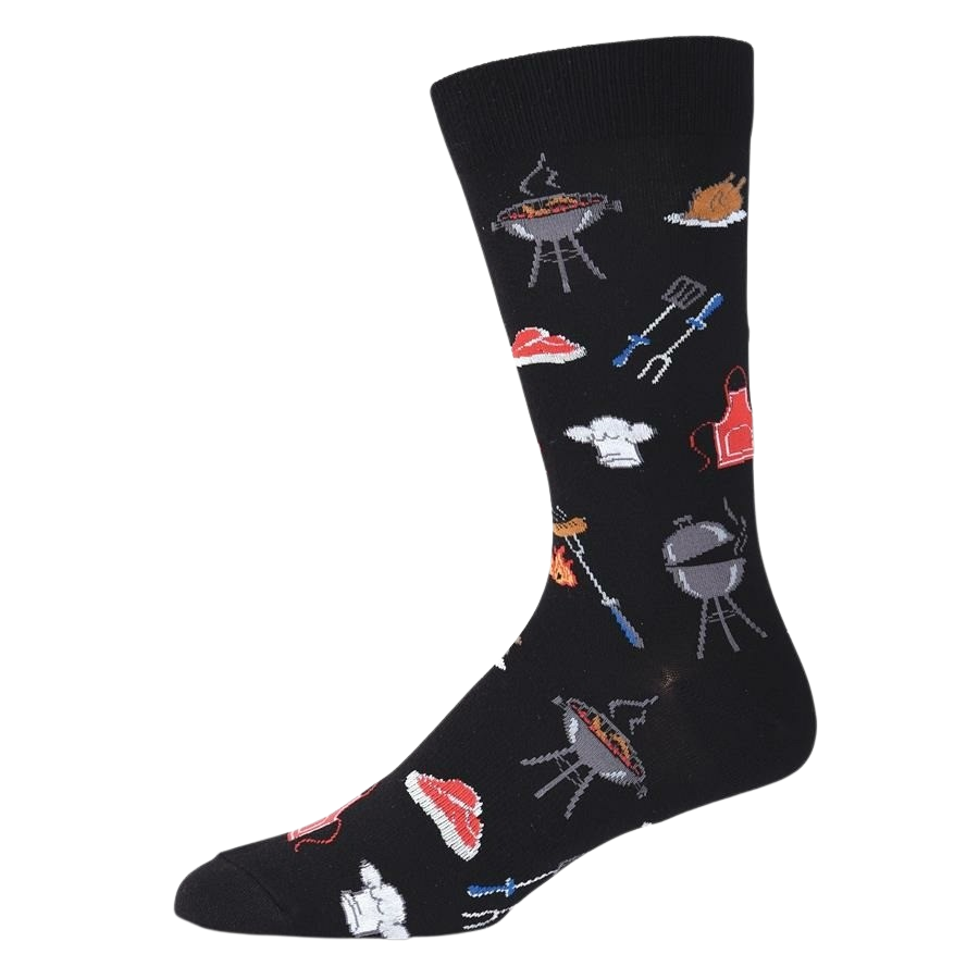 Be at the center of attention at the next BBQ event when you slip on a pair of these fun men's novelty crew socks. Whether you love to grill kebabs, shrimp, steaks, or burgers, these cool socks will have everyone's mouth-watering. Each awesome pair features aprons, grills, chef hats, and grilling tools printed all over on a black background.